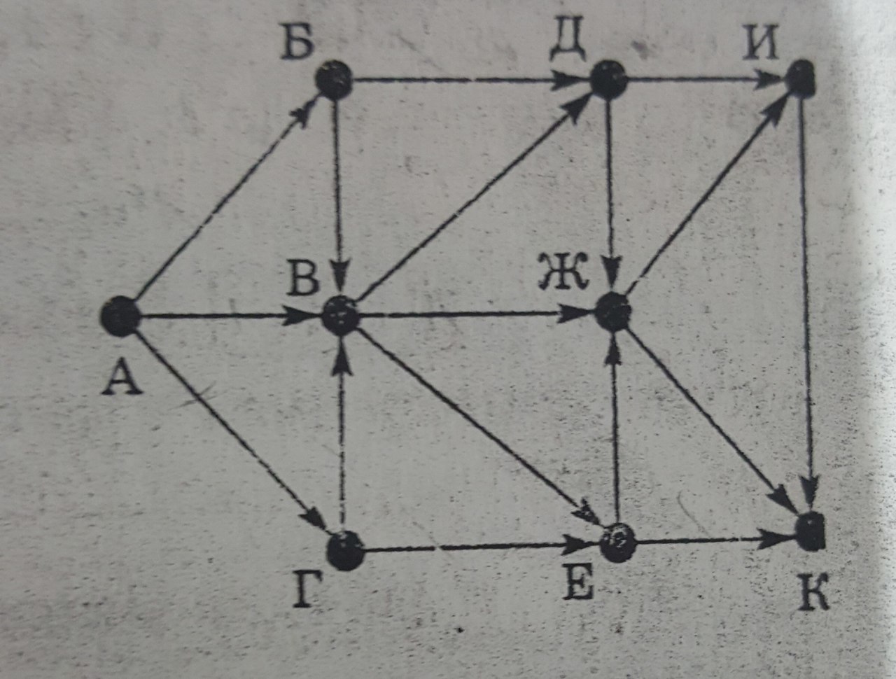 На рисунке изображена схема дорог, связывающих города абвгдежик. по каждой дороге можно двигаться только в одном направлении, указанном стрелкой. Сколько существует различных путей из города а в город к?