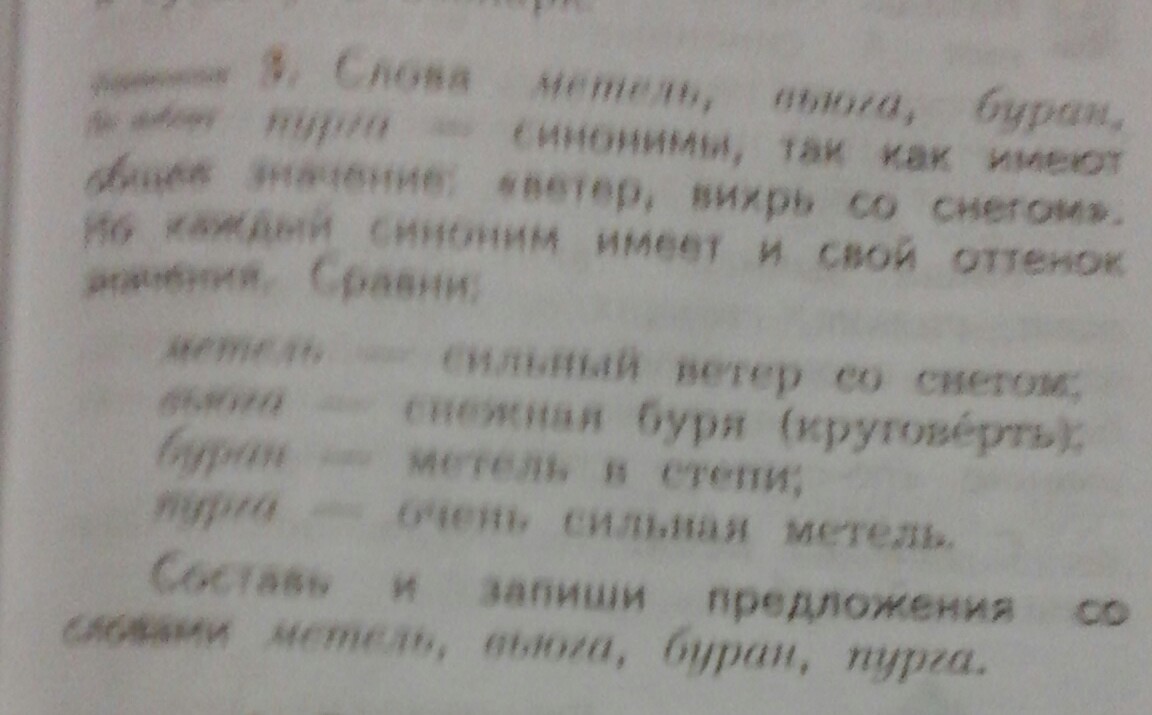 слова метель вьюга буран пурга синонимы так как имеют общее значение Ветер ветер со снегом Но каждый синоним имеет и свой оттенок значения сравнить Составь и запиши предложения со словами метель вьюга буран пурга