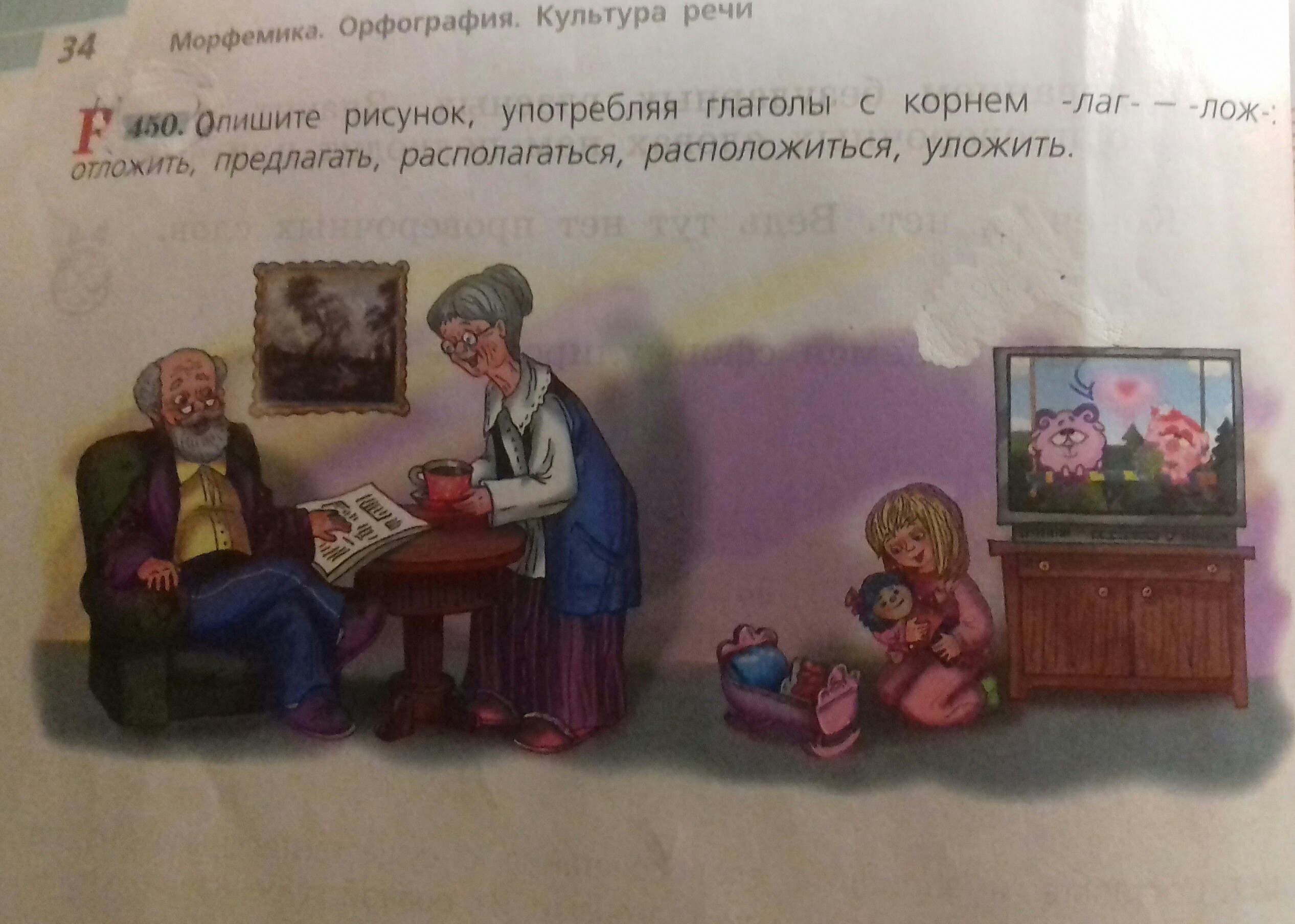 Бабушка предлагает дедушке чай. Маленькая девочка укладывает куклу. Дедушка отложил газету. Картина располагается на стене.
