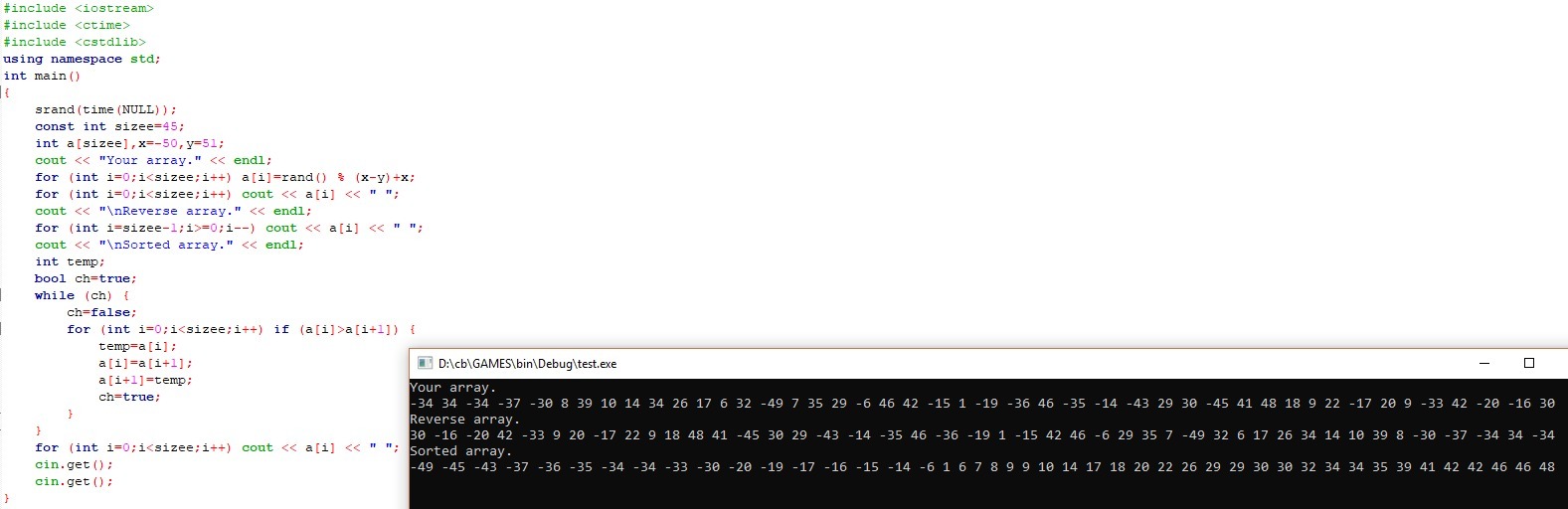 Имеем массив из 45 элементов, каждый из которых в диапазоне [-50;50]. Переставить элементы массива в обратном порядке. Отсортировать массив и вывести его на экран.