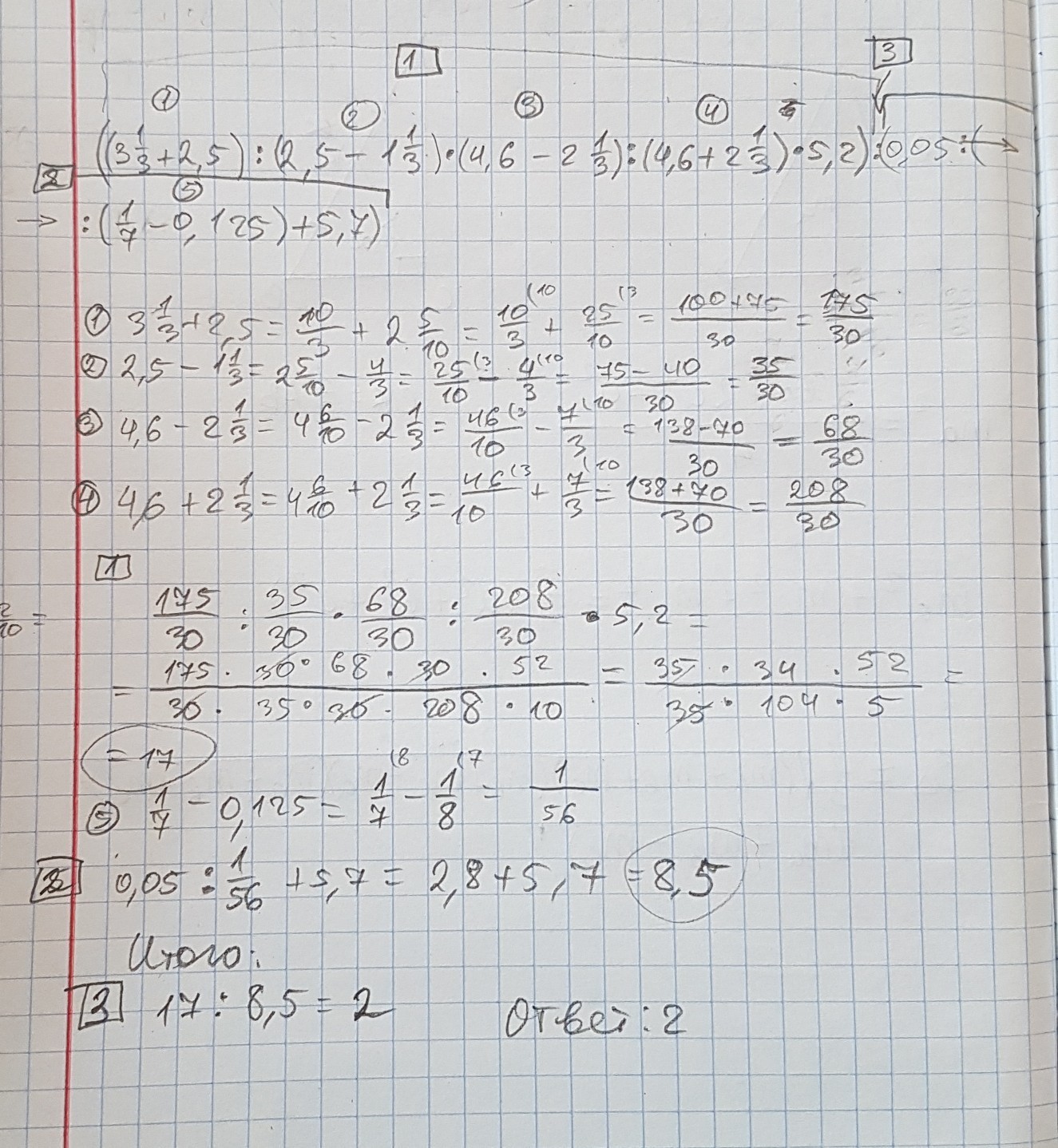((3целых 1/3+2,5):(2,5-1целая 1/3)*(4,6-2целых 1/3):(4,6+2целых 1/3)*5,2):(0,05:(1/7-0,125)+5,7)