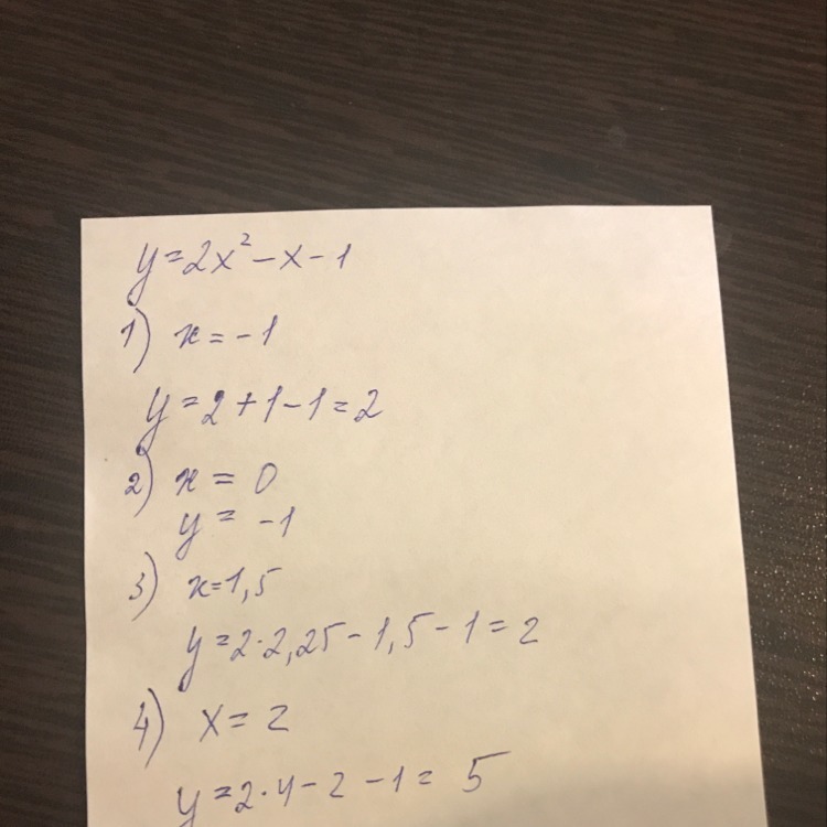 ПОМОГИТЕ С ОЛГЕБРОЙ Найдите ординату точки лежащей на графике функции у=2х^2-х-1 и абцисса которой равна 1)-1; 2)0; 3)1.5; 4)2