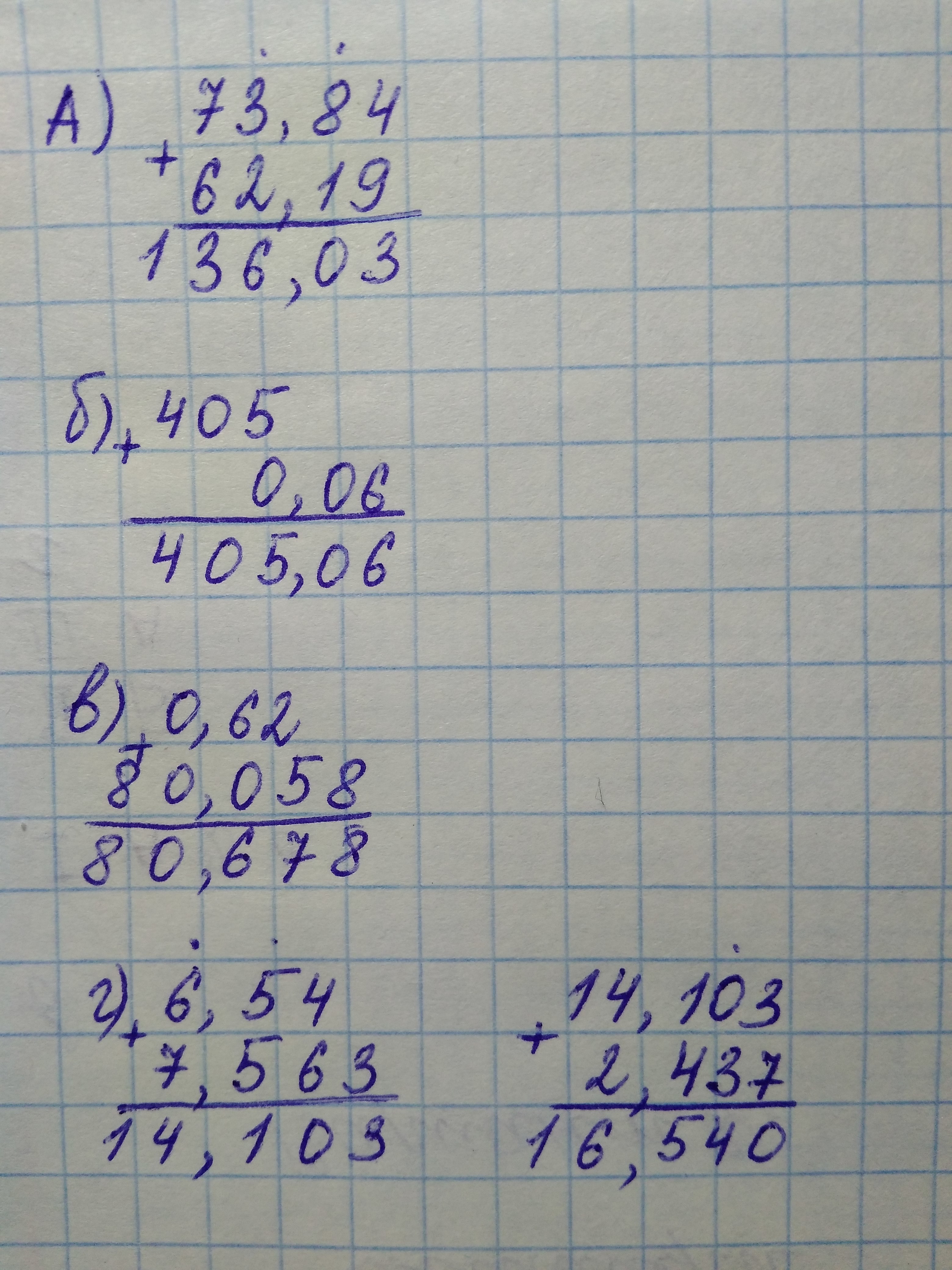 а) 73,84+62,19 в столбик б) 405+0.06 в)0,62+80,058 г) 6,54+7,563+2,437