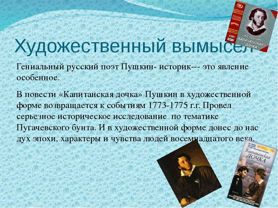 Гениальный русский поэт Пушкин- историк--- это явление особенное. В повести «Капитанская дочка» Пушкин в художественной форме возвращается к событиям 1773-1775 г.г. Провел серьезное историческое исследование по тематике Пугачевского бунта. И в художественной форме донес до нас дух эпохи, характеры и чувства людей восемнадцатого века.