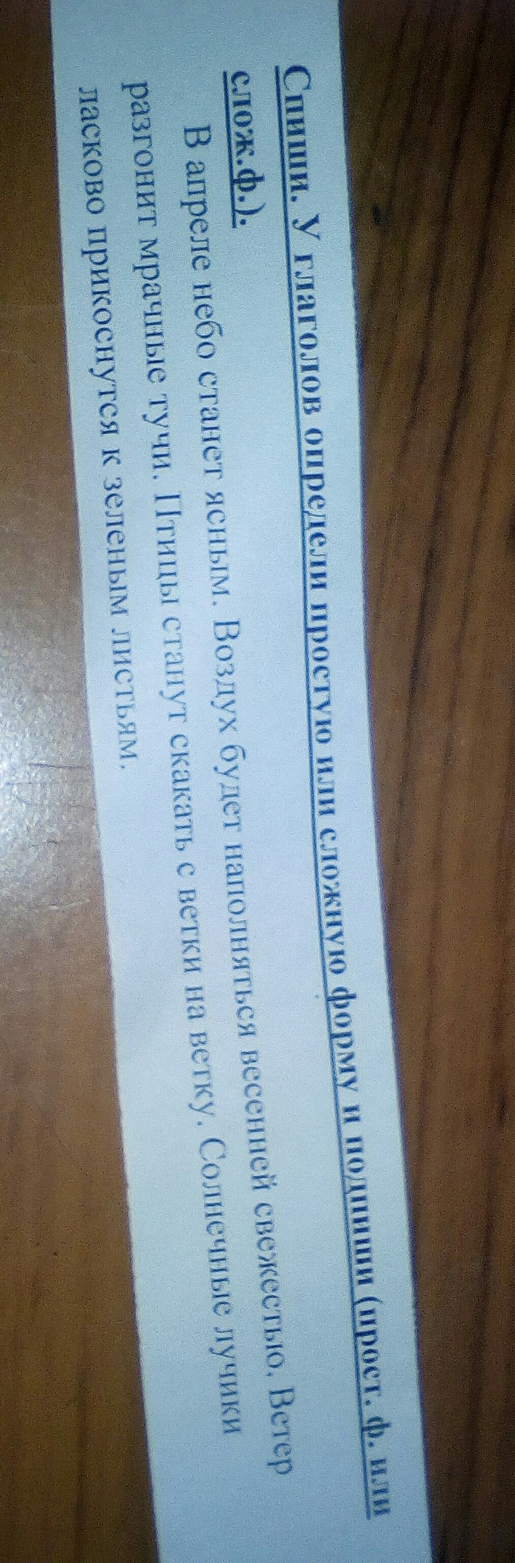 В апреле небо станет(прост.ф) ясным.Воздух будет наполняться (слож.ф) весенней свежестью.Ветер разгонит(прост.ф) мрачные тучи.Птицы станут скакать(слож.ф.) с ветки на ветку.Солнечные лучики ласково прикоснутся(прост.ф.) к зелёным листьям.