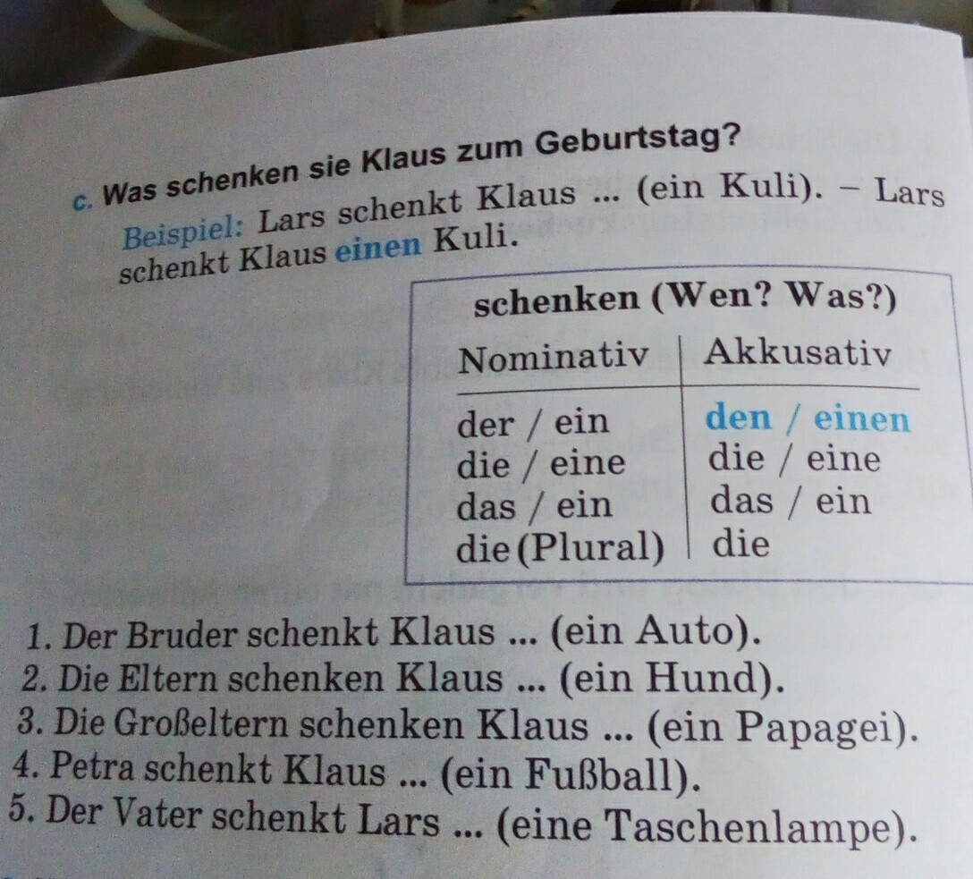 1. ein 2. einen 3. einen 4. einen 5. eine