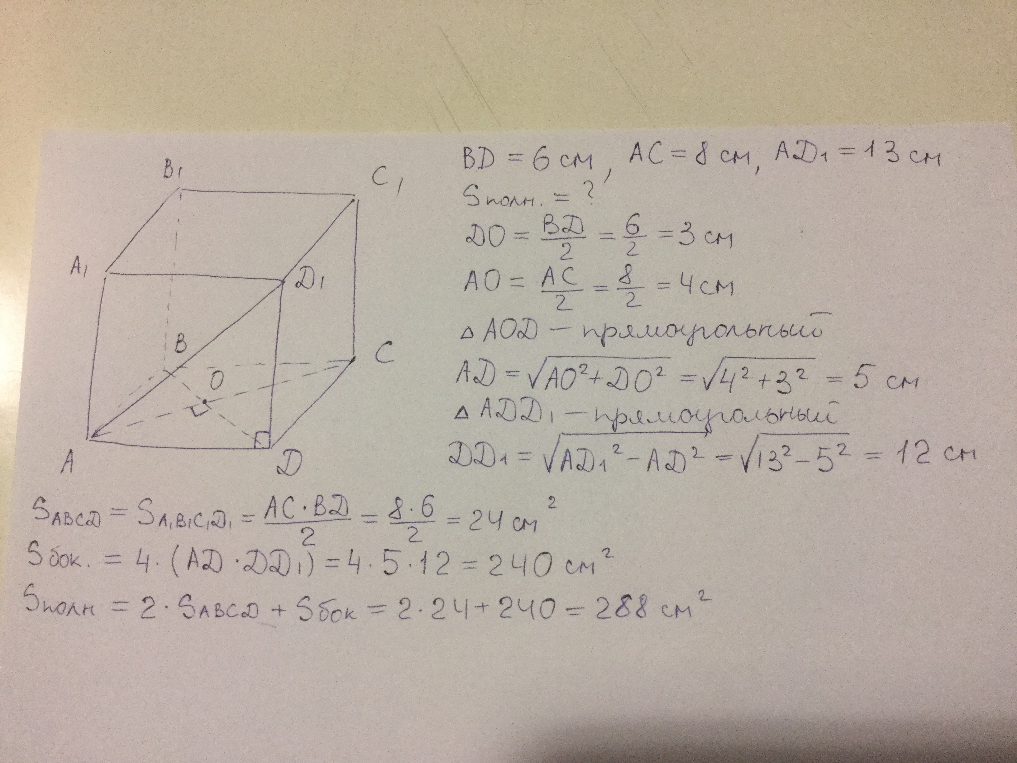 Основание прямого параллелепипеда - ромб с диагоналями 6 и 8 см; Длина диагонали боковой грани 13 см. Найдите площадь полной поверхности этого параллелепипеда.
