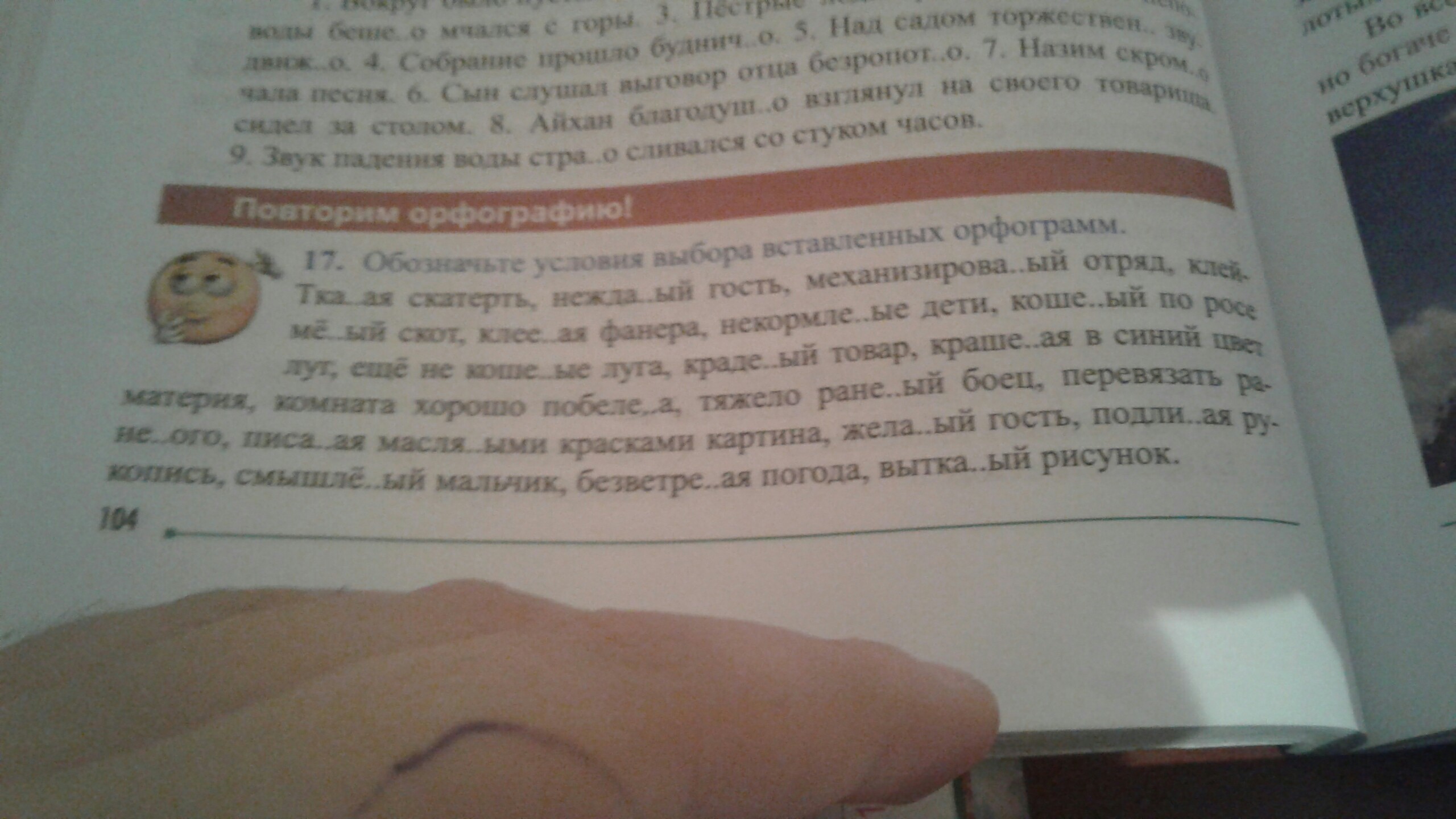 Тканая скатерть, нежданный гость, механизированный отряд, клейменый скот, клееная фанера, некормленые дети, кошенный по росе луг, еще не кошенные луга, краденый товар, крашенная в синий цвет материя, комната хорошо побелена, тяжело раненый боец, перевязывать раненного, писанная масляными красками картина, желанный гость, подлинная рукопись, смышленый мальчик, безветренная погода, вытканный рисунок.