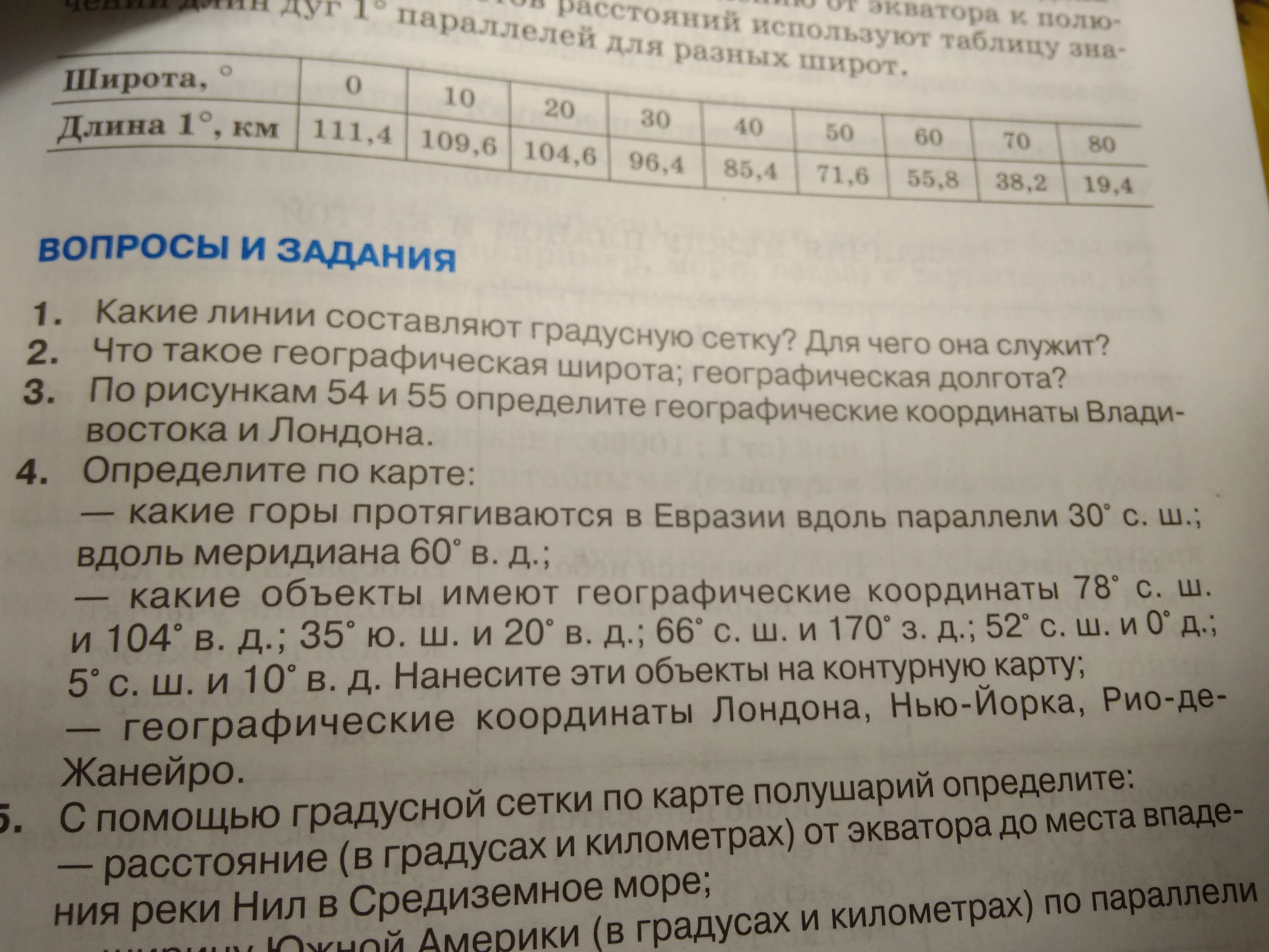 1. 30° Гималаи !2. Вдоль меридиана 60° в.д протянулись Уральские горы .3. 78° с.ш. и 104° в.д.-мыс Челюскин-северная точка России .4. 35° ю.ш. и 20° в.д.-мыс Игольный-южная точка Африки.5. 66° с.ш. и 170 з.д. -Берингов-пролив.6. Лондон7. Вулкан Камерун 8. Лондон-52° с.ш. и 0° д.9. Нью-Йорк- 41° с.ш. и 74° з.д.10. Рио-де-Жанейро - 23° ю.ш. 43° з.д.