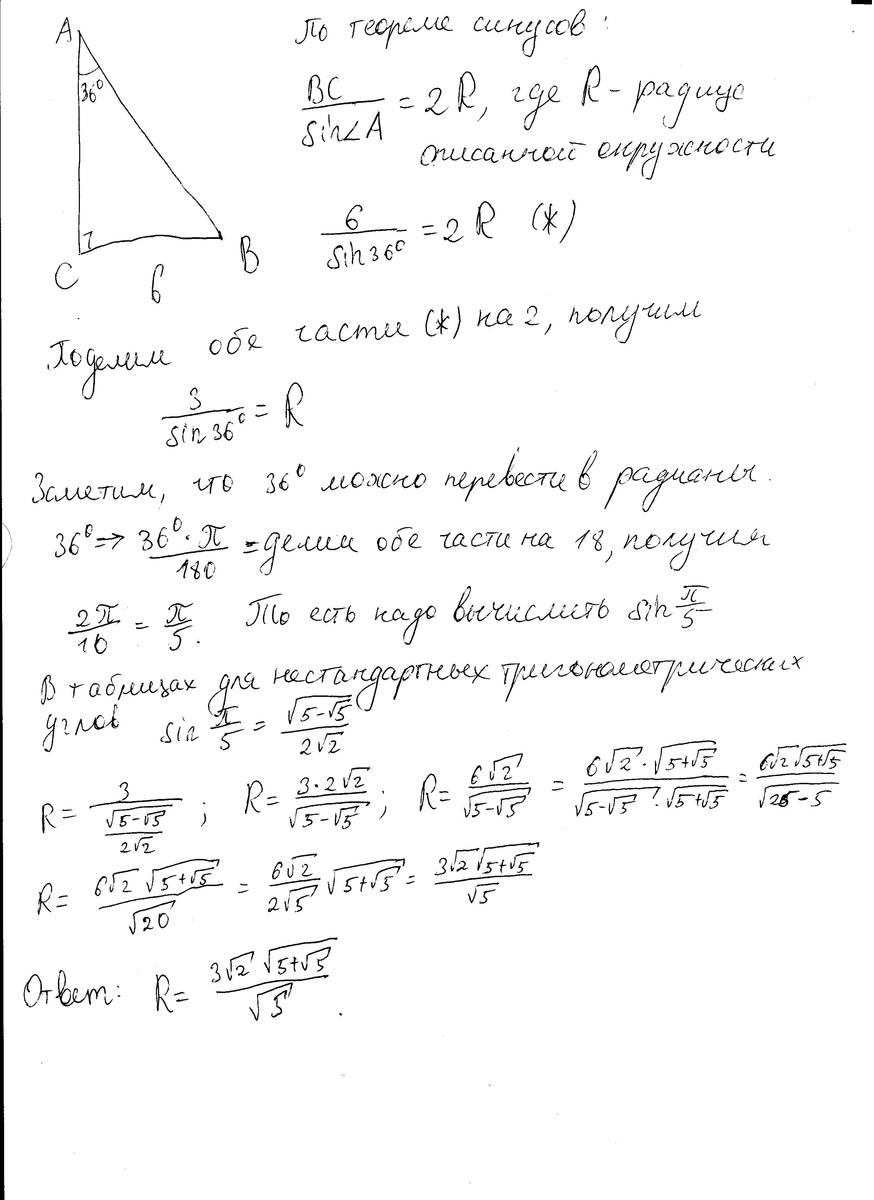 Треугольник АВС остроугольный угол А = 36градусов, ВС = 6. Найти радиус описанной окружности! Нужно решение!