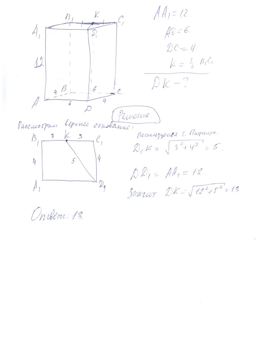 в прямоугольном параллелепипеде АВСДА1В1С1Д1 известно,что АВ=4,ВС=6,АА1=12.Найти длину отрезка ДК,где К-середина ребра В1С1