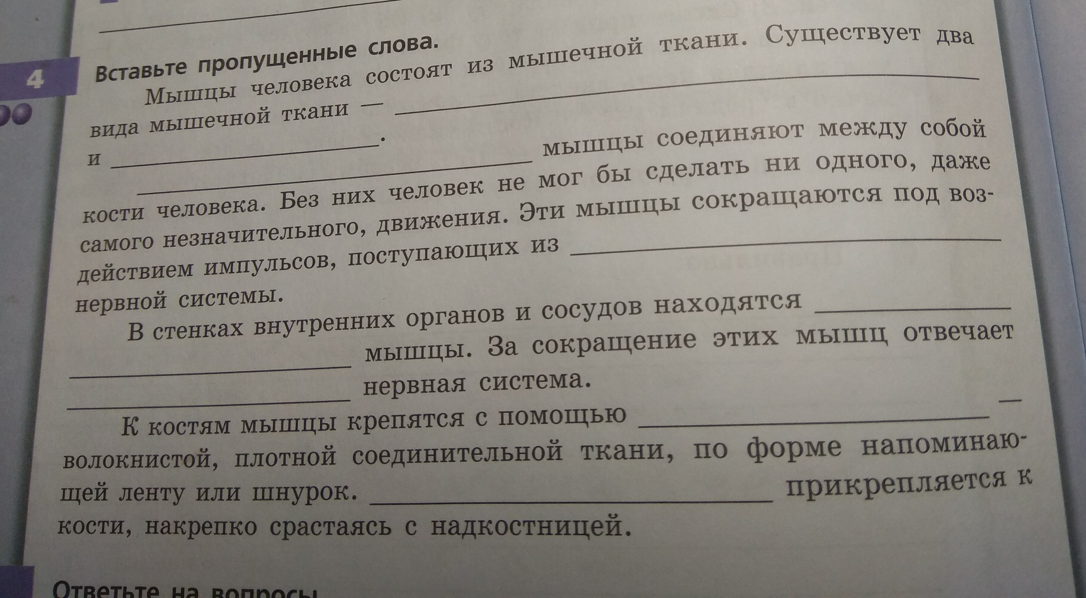 импульсов, поступающих из центральной нервной системы.В стенках внутренних органов и сосудов находятся гладкие мышцы. За сокращение этих мышц отвечает вегетативная нервная система. К костям мышцы крепятся с помощью сухожилий—волокнистой плотной соединительной ткани по форме напоминающей ленту или шнурок. Сухожилия прикрепляются к кости, накрепко срастаясь с надкостницей.