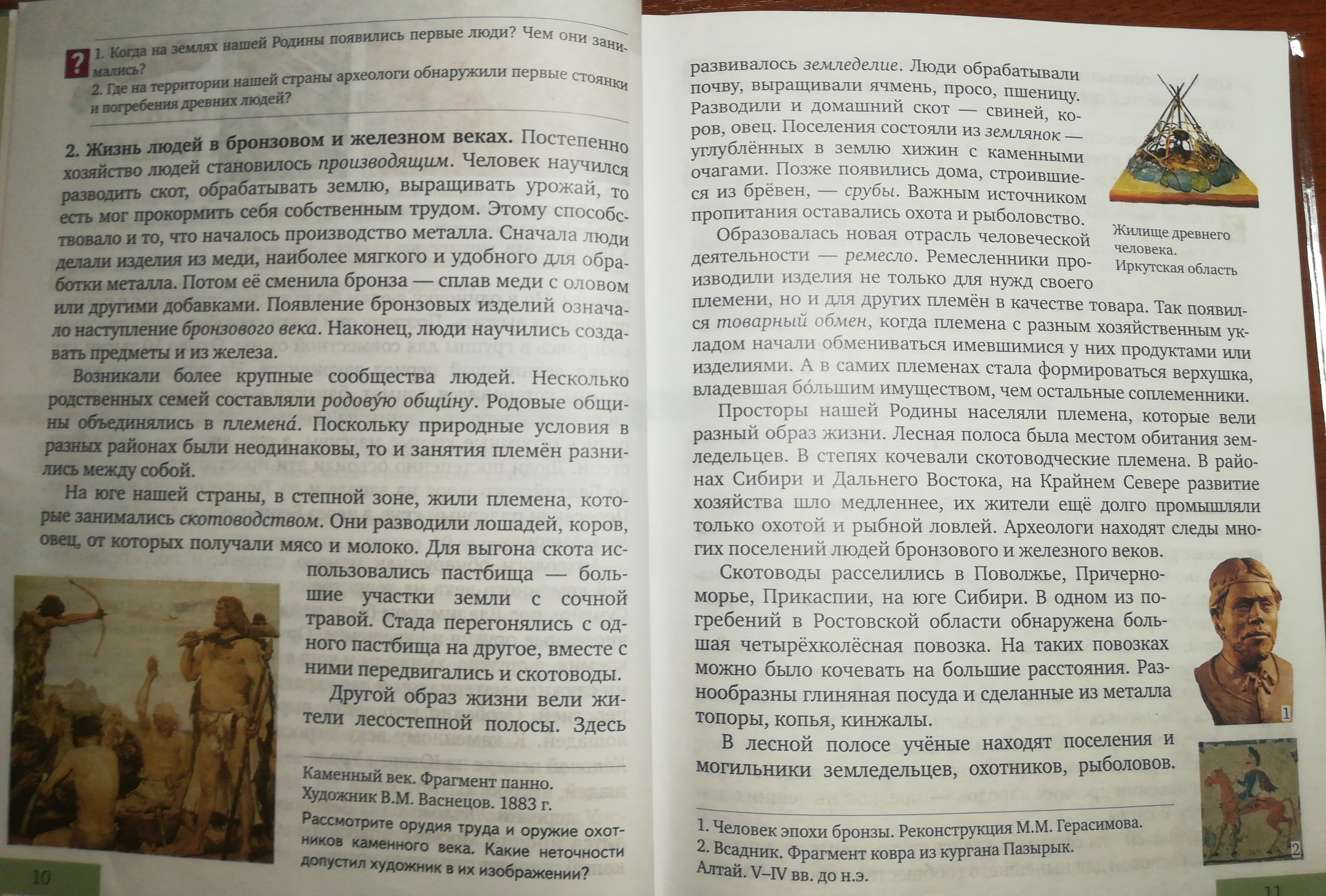 Изначально человек мог прокормить себя собственным трудом.Этому способствовало и то,что началось производство металла.С начало начали делать изделия из меди,потом из бронзы и на конец из железа. Постепенно люди стали объединятся в родовые общины ,а за тем и в племена. Поскольку на разных участках условия были не одинаковы,то и занятия племён были разные.На юге нашей страны , в степной зоне ,жили племена , которые занимались скотоводством.Они разводили лошадей, коров и овец ,из которых получали мясо и молоко. Жители лесостепной полосы занимались земледелием.Они обрабатывали почву, выращивали зерновые культуры ,разводили домашний скот (свиней,коров,овец) и жили в землянках ,после стали жить в срубах(Дома из брёвен) и занимались охотой и рыболовством,которые являлись основным источником пищи.Образовалась новая человеческая деятельность -ремесло .Благодаря ей возник обмен товарами в разных племенах.В районах Сибири и Дальнего Востока,на Крайнем Севере развитие шло медленнее ,поэтому племена населявшие ети места занимались рыболовством и охотой.