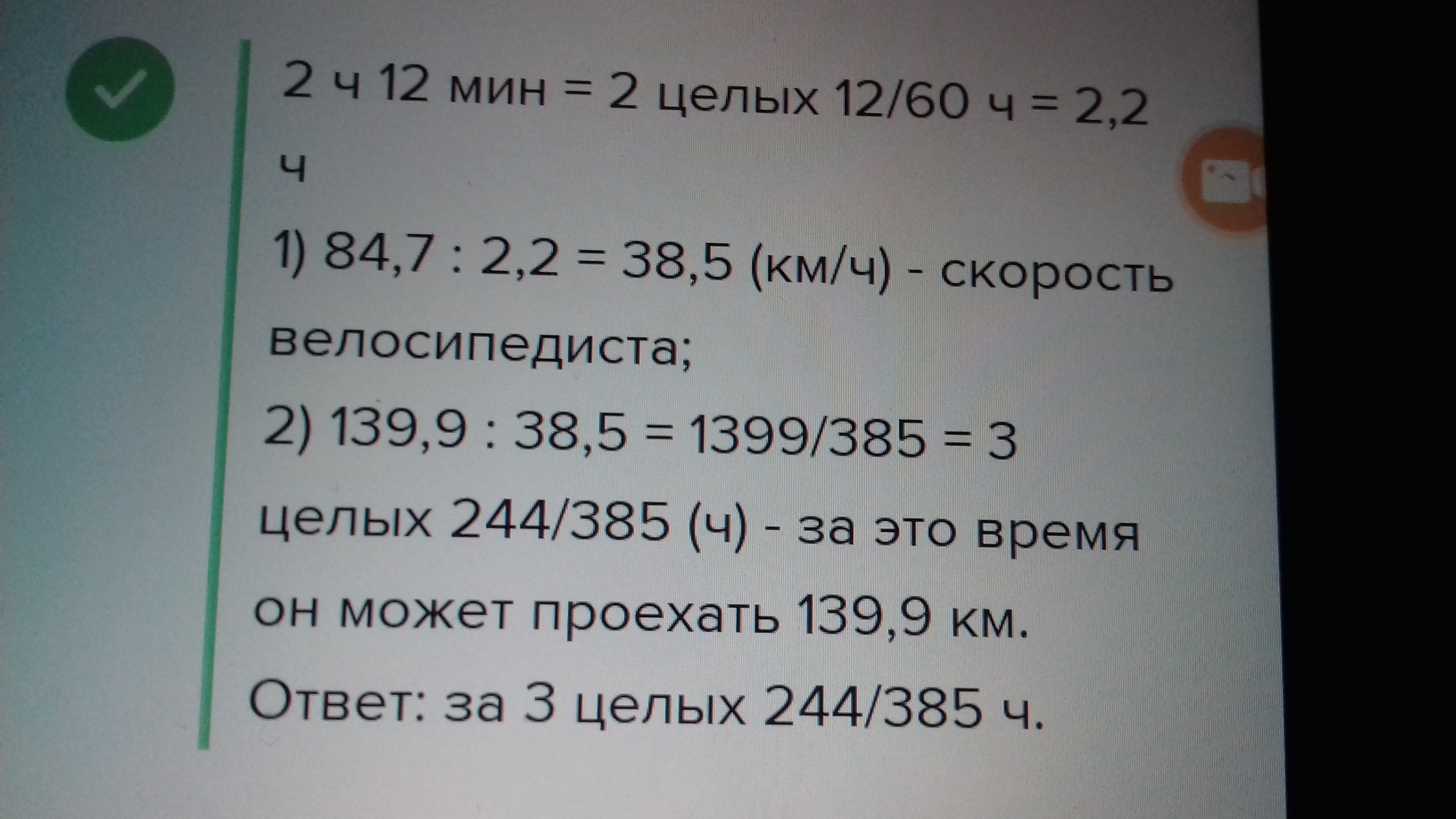 Во время тренировки спортсмен на велосипеде ппоехал 84.7 км за 2 часа 12 минут. За какое время он может проехать 130.9 км.