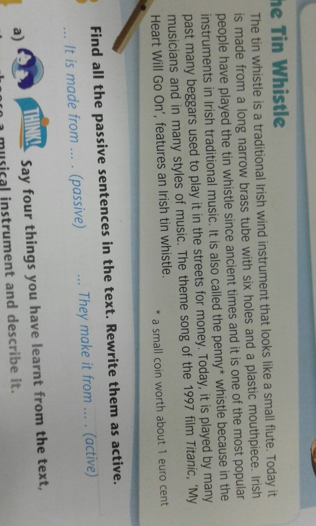 Оловянный свисток - традиционный ирландский духовой инструмент, который выглядит как небольшая флейта. Сегодня он сделан из длинной узкой латунной трубки с шестью отверстиями и пластиковым мундштуком. Ирландские люди играли на оловянном свистке с древних времён, и это один из самых популярных инструментов в традиционной ирландской музыке. Его также называют свистком, потому что в прошлом многие нищие играли на нём на улицах за деньги. Сегодня на нём играют многие музыканты и во многих стилях музыки. Тематическая песня фильма "Титаник" 1997 года, "Моё сердце будет продолжаться", показывает ирландский оловянный свисток.