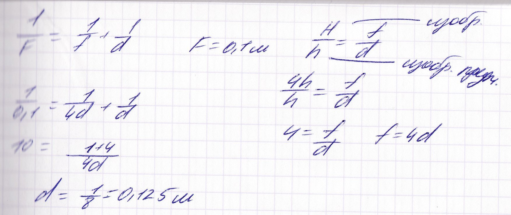 перед собирающей линзой с фокусным расстоянием 10 см помещен предмет . На каком расстоянии надо поставить предмет чтобы его действительное изображение было в 4 раза больше самого предмета