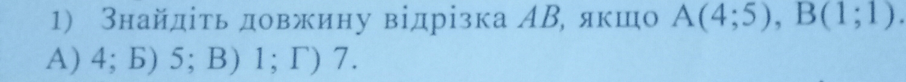 AB = под корнем (Xв-Xa)^2+(Yв-Yа)^2 = под корнем (1-4)^2+(1-5)^2= под корнем (-3)^2+(-4)^2 = под корнем (9+16) = под корнем (25) = 5