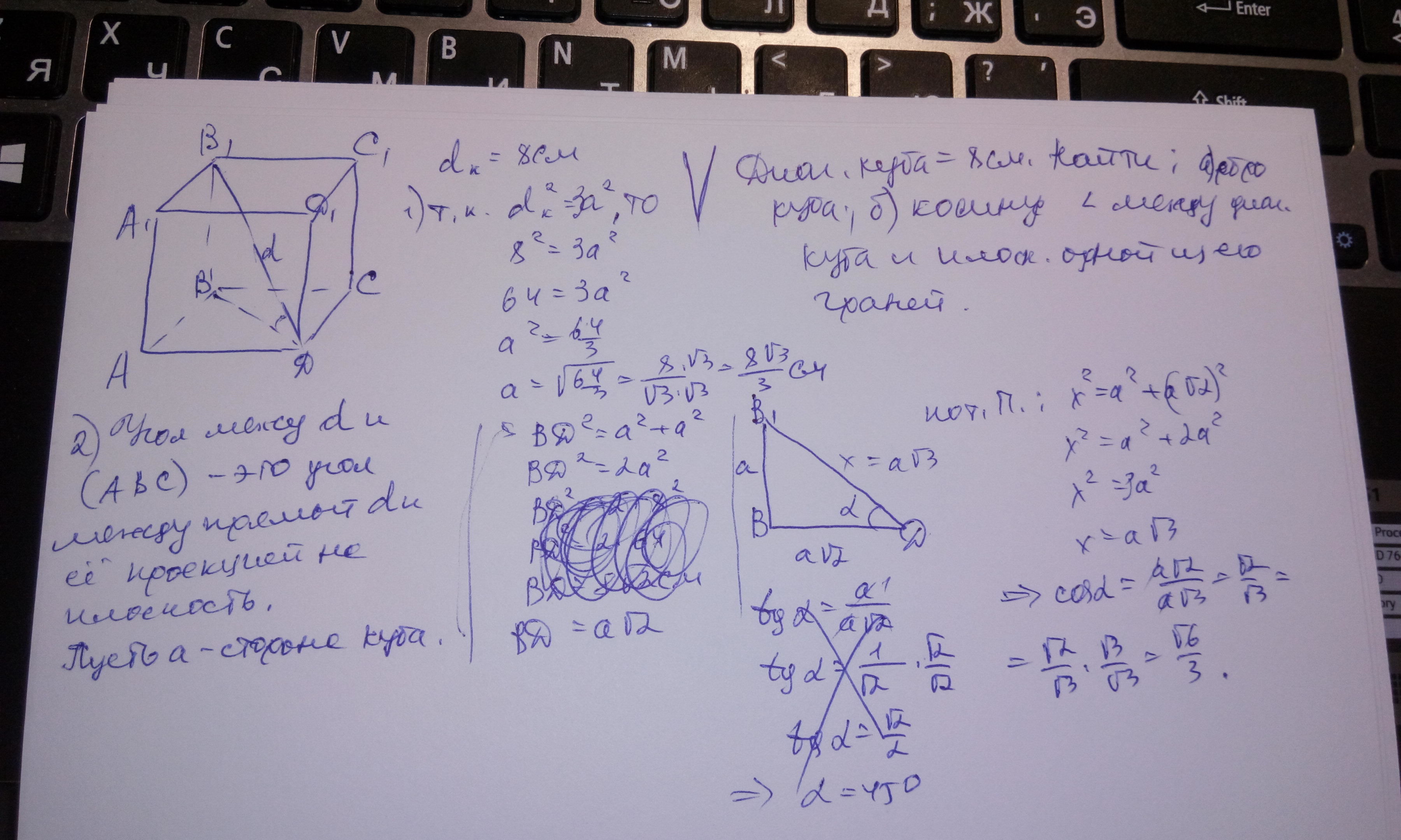 Диагональ куба равна 8см. Найти: а) ребро куба,б) косинус угла между диагональю куба и плоскостью одной из его граней.