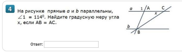 У равнобедреного треугольника углы при основе равны. Сумма углов треугольника равна 180 градусов. Отсюда угол х равен (180 - 114)/2 = 33 градуса.