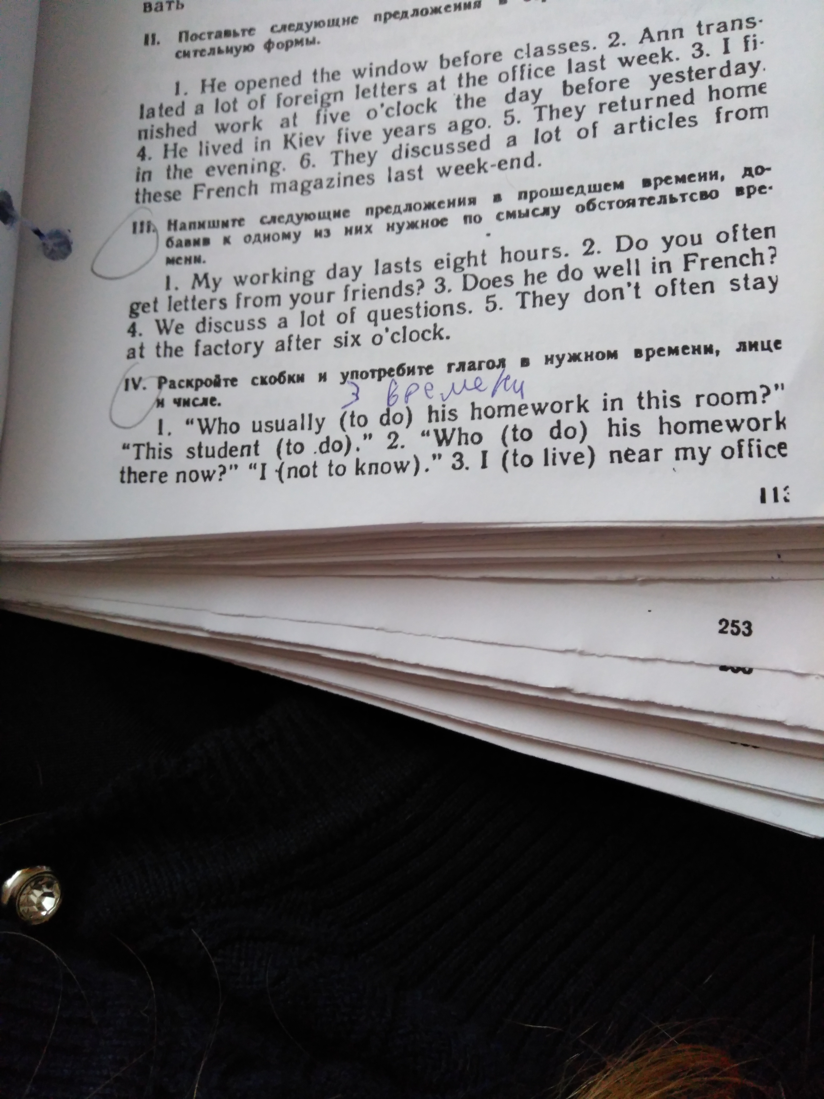 1 My working day lasted eight hours yesterday. 2 Did you often get letters from your friends last year? 3 Did he do well in French two days ago? 4 We discussed a lot of questions yesterday. 5 They didn't often stay at the factory after six o' clock last month.