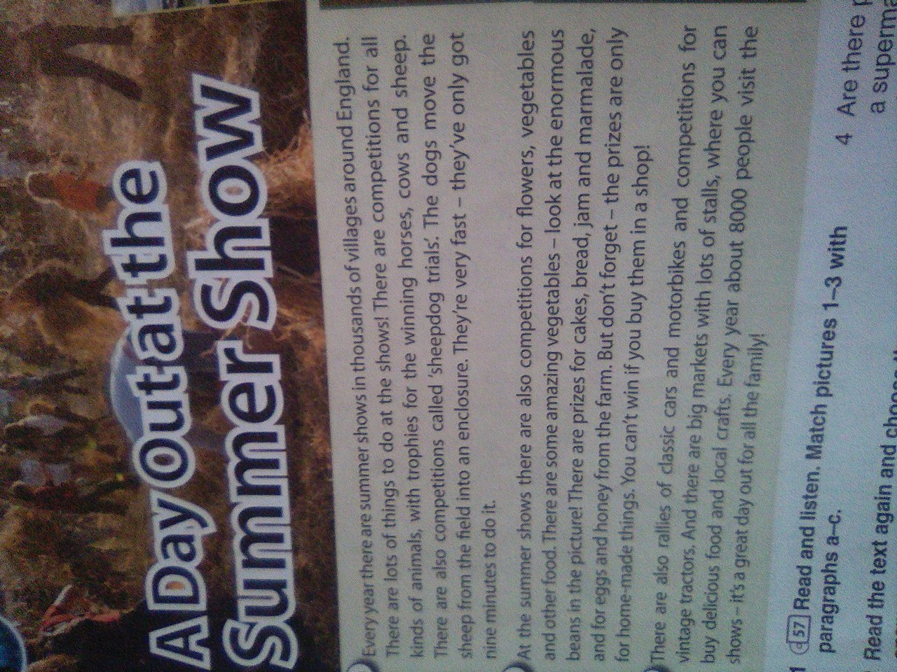 Каждый год в тысячах деревень вокруг Англии проводятся летние шоу. На шоу есть много вещей! Есть соревнования для всех видов животных, с трофеями для выигрывающих лошадей, коров и овец. Есть также соревнования, называемые испытаниями овчарки. Собаки перемещают овец с поля в корпус. Они очень быстры, у них есть только девять минут, чтобы это сделать. На летних шоу также проводятся конкурсы на цветы, овощи и другую пищу. Здесь столько потрясающих овощей- посмотрите на эти огромные бобы на картинке! Есть призы для тортов, хлеба, варенья и мармелада, а также яйца и мед из фермы. Но не забывайте, что призы - только для домашних вещей. Вы не можете выиграть, если вы купите их в магазине! Также проводятся авторалли классических автомобилей и мотоциклов и соревнования для старинных тракторов. И есть большие рынки с множеством ларьков, где вы можете купить вкусную еду и местные ремесла. Каждый год около 8000 человек посещают шоу - это отличный день для всей семьи!