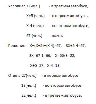 Решите задачу: Учащиеся трёх седьмых классов поехали на экскурсию за город в трёх автобусах. В третьем автобусе сидело на 5 учеников меньше,чем в первом,и на 4 человека больше,чем во втором.Сколько учеников сидело в каждом автобусе,если всего на экскурсию поехали 67 учеников?