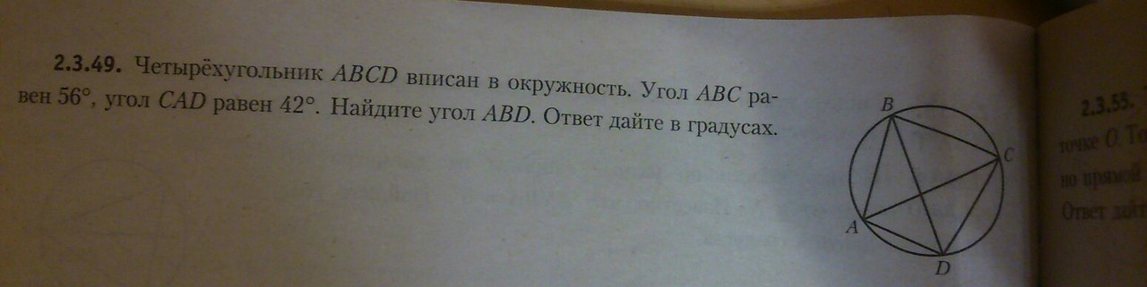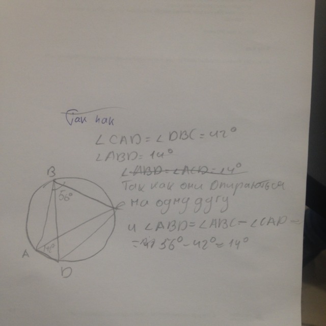 Так как они опираются на одну дугу то искомый угол равен 56-42=14 градусов