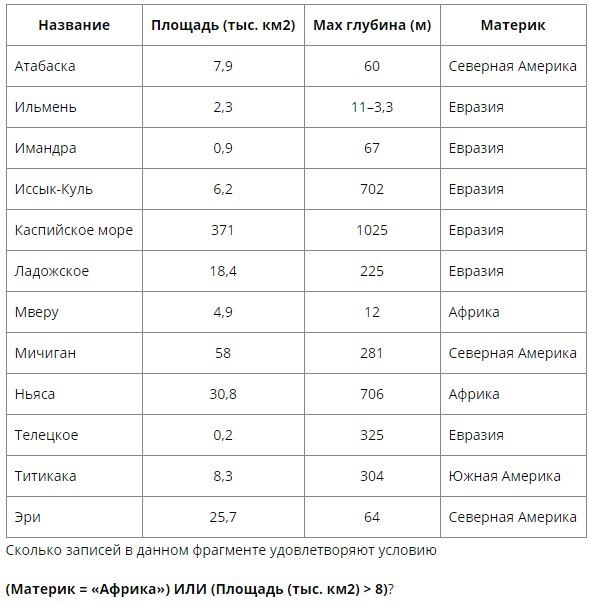 "(Площадь (тыс.км2) > 8)": Каспийское море, Ладожское, Мичиган, Ньяса, Титикака, Эри.
