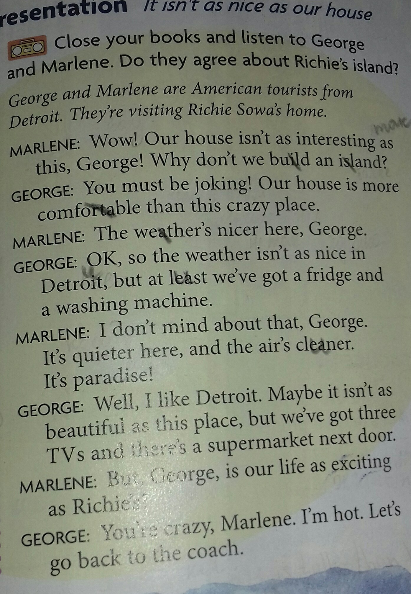МАРЛЕН: Ого! Наш дом не так интересен, Джордж! Почему мы не строим остров? ДЖОРДЖ: Вы, должно быть, шутите! Наш дом очень приятный, чем это безумное место. МАРЛЕН: Погода здесь лучше, Джордж. ДЖОРДЖ: Хорошо, поэтому погода не так хороша в Детройте, но, по крайней мере, у нас есть холодильник и стиральная машина. МАРЛЕН: Я не возражаю, Джордж. ДЖОРДЖ: Ну, мне нравится Детройт. Может быть, это не MARLENE. Бу эорхе, наша жизнь захватывающая. Здесь тише, и чище воздуха. Это рай! красиво, как это место, но у нас есть три телевизора, а по соседству - супермаркет, а Ричи возвращается к тренеру. ДЖОРДЖ: Ты сумасшедший, Марлен. Мне жарко. Давайте вернёмся к тренеру.