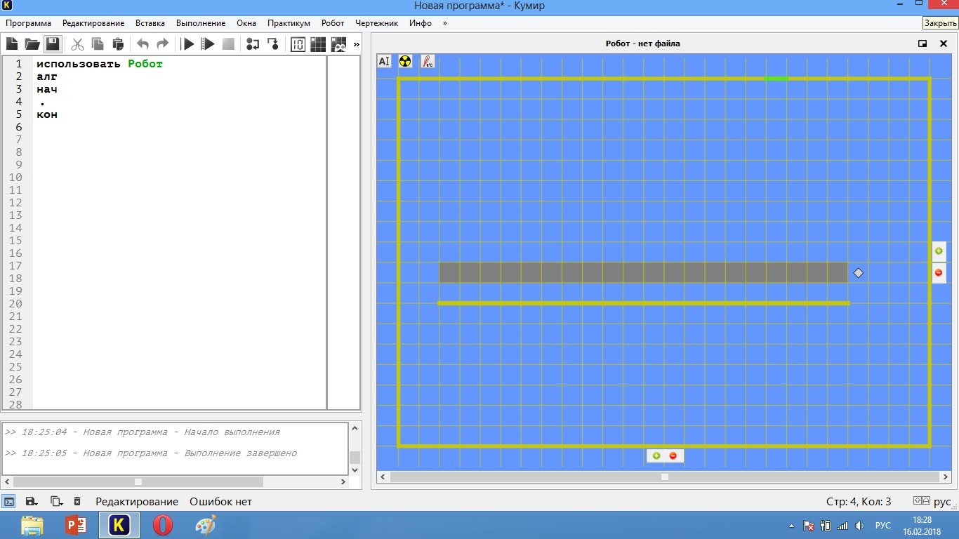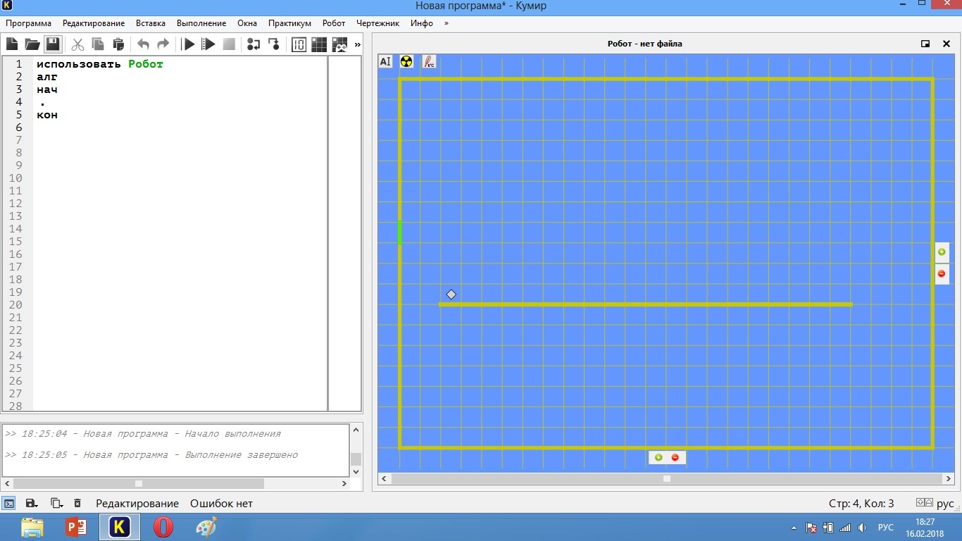 Помогите, какие программы надо написать, чтобы робот прошёл данный путь в КуМире? 1-ое фото – изначальная обстановка, второе – после окончания алгоритма. И прошу, чтобы не было много повторяющих действий, например: "закрасить" "вправо" и так много раз, надо чтоб было с "нц" и "кц" или там "если" "то" "иначе". Благодарю заранее.