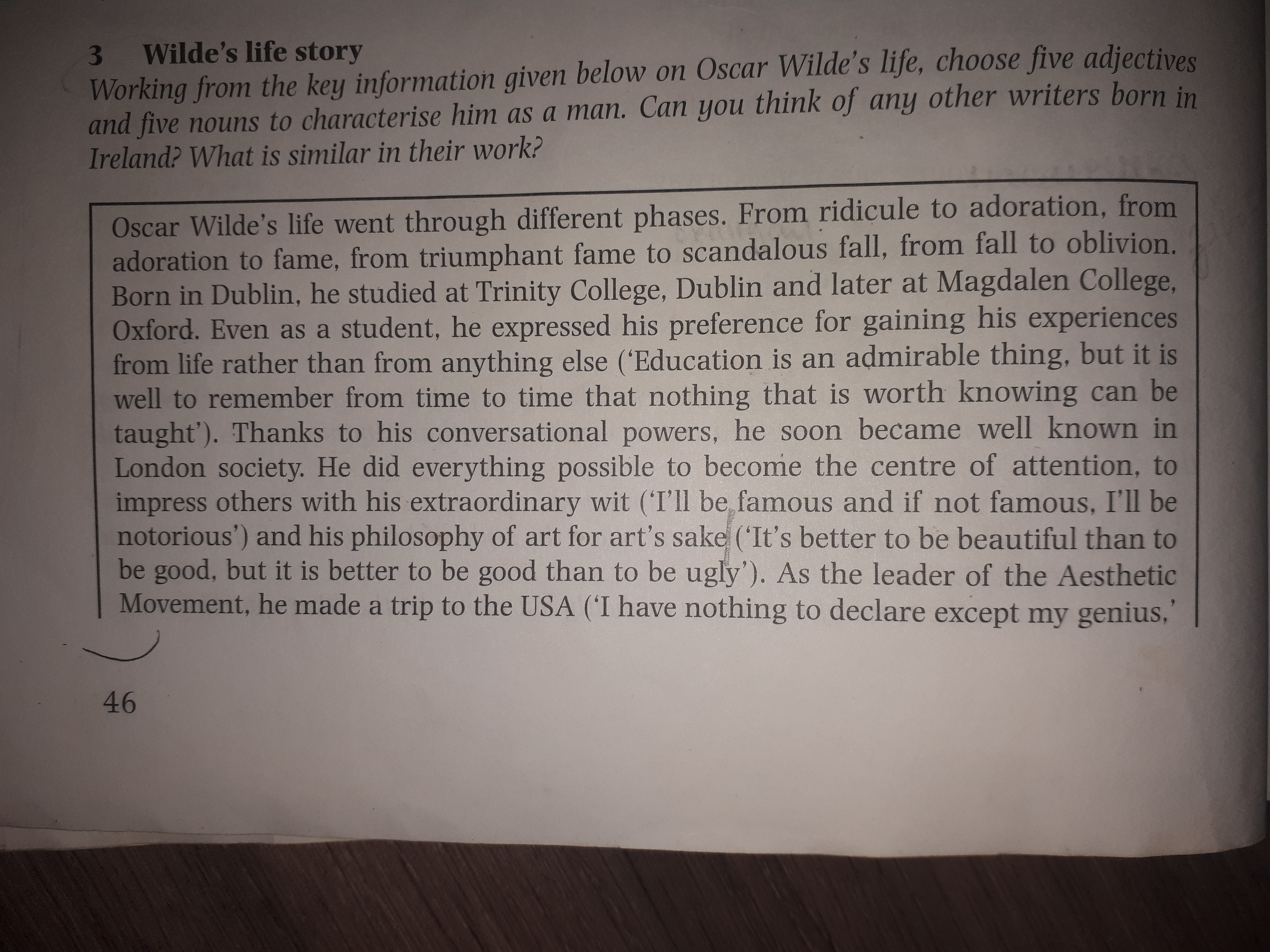 Жизнь Оскара Уайлда прошла через разные этапы. От осмеивания до восхищения, от восхищения до славы, от триумфальной славы до скандального падения, от падения до забвения. Родившись в Дублине, он учился в колледже Тринити, Дублина и позже в колледже Магдалены, Оксфорд. Даже будучи студентом, он выражал своё предпочтение получать опыт на практике, чем что-либо другое ("Образование это восхитительная вещь, но это хорошо вспоминать время от времени, что всему тому, чему стоит научиться, невозможно научить"). Благодаря его способностям к ведению разговоров, он вскоре стал известным в Лондонском обществе. Он делал всё возможное, чтобы быть в центре внимания, чтобы впечатлять других его экстраординарным остроумием ("Я буду известным, а если не буду, то я буду печально известным") и его философия искусства ради искусства ("Гораздо лучше быть красивым, чем быть хорошим, но гораздо лучше быть хорошим, чем быть уродливым"). В качестве лидера Эстетического Движения, он совершил поездку в США ("Мне нечего декларировать кроме как своей гениальности").