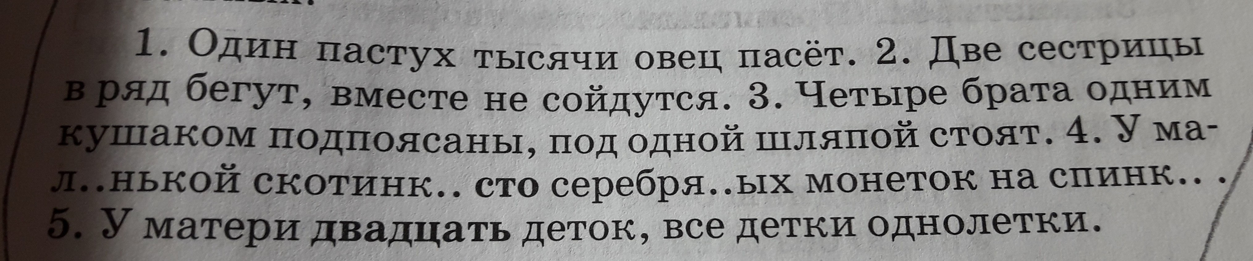 У маленькой скотинки сто серебряных монеток на спинке. Это пропущенные буквы. В 5 предложении 1 числительное, но здесь могу ошибаться.
