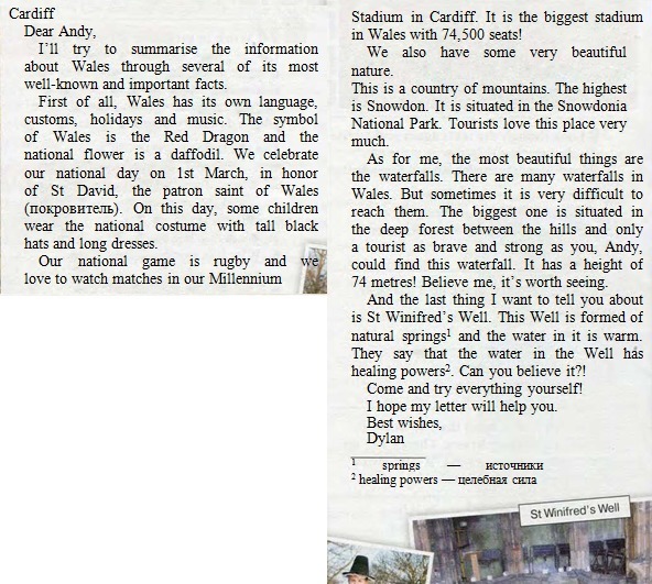 Кардифф Стадиун в Кадифе. Это самый большой стадион в Уэльсе с 74 500 местами! Дорогой Энди, давайте суммировать информацию об Уэльсе через несколько из его самых известных и важных фактов. У нас также есть очень красивая природа. Это страна гор. Самое высокое. Прежде всего, Уэльс имеет свой собственный язык, это Сноудон. Он расположен в таможнях Сноудонии, праздниках и музыке. Символ Национальный Парк Туристы любят эту пиасе очень, и большая часть Уэльса - национальный цветок Красного Дракона - нарцисс. Мы празднуем. Что касается меня, то самые красивые вещи - это водопады Святого Давида, покровителя Уэльса Уэльса. Но иногда это очень сложно (noKpoBHTeab). В этот день некоторые дети доходят до них. Самый большой из них - это глубокий лес между холмами, и только турист, как храбрый и сильный, как вы, Энди. Или урациональные руины рубина могли найти водопад. У этого есть высота нашего национального дня на март, в честь waterfails. Есть глубокий fotest носить национальный костюм с черными шляпами и длинными платьями. любите смотреть матчи в нашем тысячелетнем тысячелетии! Поверьте, это стоит посмотреть. И последнее, о чем я хочу вам рассказать, это «Сэн-Винифред». Этот колодец образован из природных источников и воды. Говорят, что вода в колодце имеет в нем теплые целебные свойства ?. Ты можешь в это поверить?! Приходите и попробуйте все сами, я надеюсь, что мое письмо выберет вас. С наилучшими пожеланиями Дилан