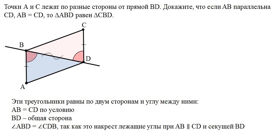 Точки А и С лежат по разные стороны от прямой BD. Докажите, что если AB параллельна CD, AB=CD, то треугольник ABD равен треугольнику CBD