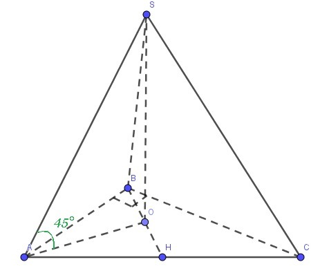 Рассмотрим прямоугольный треугольник SOA, в нём ∠SAO=45°, тогда ∠ASO=90°-∠SAO = 90° - 45° = 45°, следовательно, треугольник SOA равнобедренный прямоугольный треугольник: SO = OA = 5/2 см.