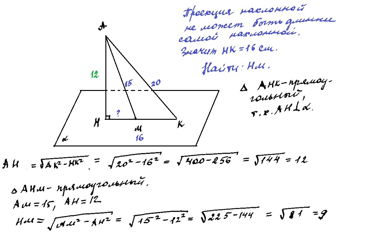 Из точки расположенной вне плоскости проведены две наклонные равные 15 и 20 см проекция одной из равна 16 см Вычислите длину проекции другой наклонной! помогите! пожалуйста!