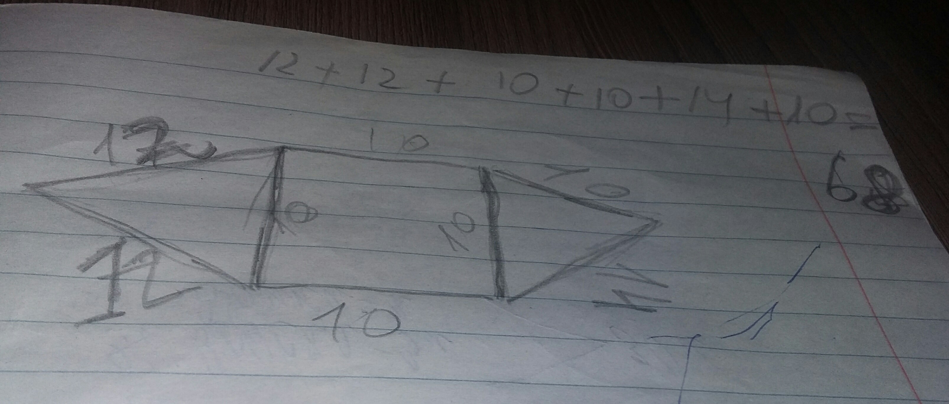 к двум соседним сторонам квадрата приложили два разных треугольника так что одна из сторон каждого треугольника совместилась со стороной квадрата.у каждого треугольника две стороны равны.периметр каждого треугольника равен 34см.площадь квадрата равна 100см в квадрате.найдите периметр получившейся фигуры.
