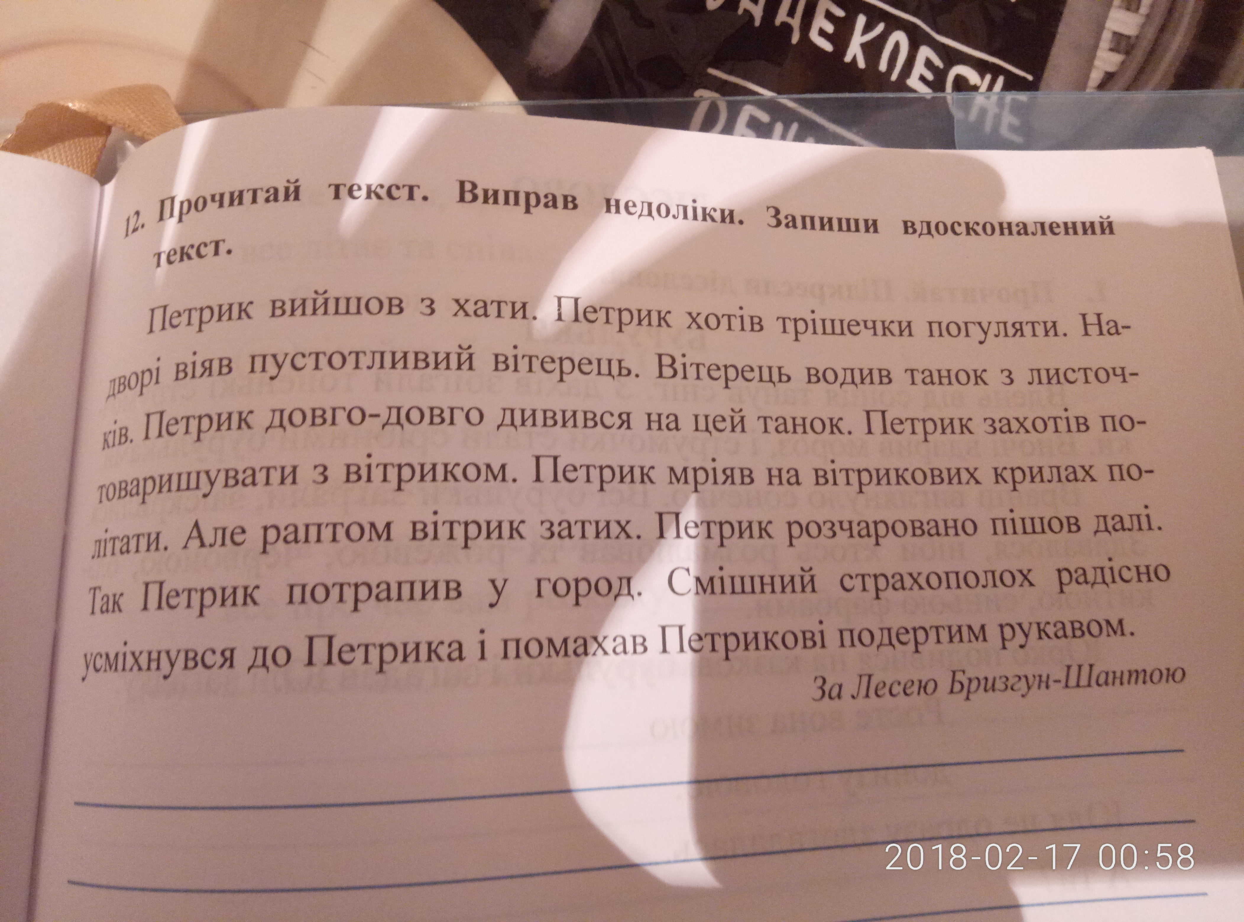 Петрик вийшов з хати. Він хотів трішечки погуляти. Надворі віяв пустотливий вітерець. Він водив танок з листочків. Хлопчик довго-довго дивився на цей танок. Він захотів потоваришувати з вітриком. Петрик мріяв на його крилах політати. Але раптом той затих. Хлопчик розчаровано пішов далі. Так він потрапив у город. Смішний страхополох радісно усміхнувся до Петрика і помахав йому подертим рукавом.