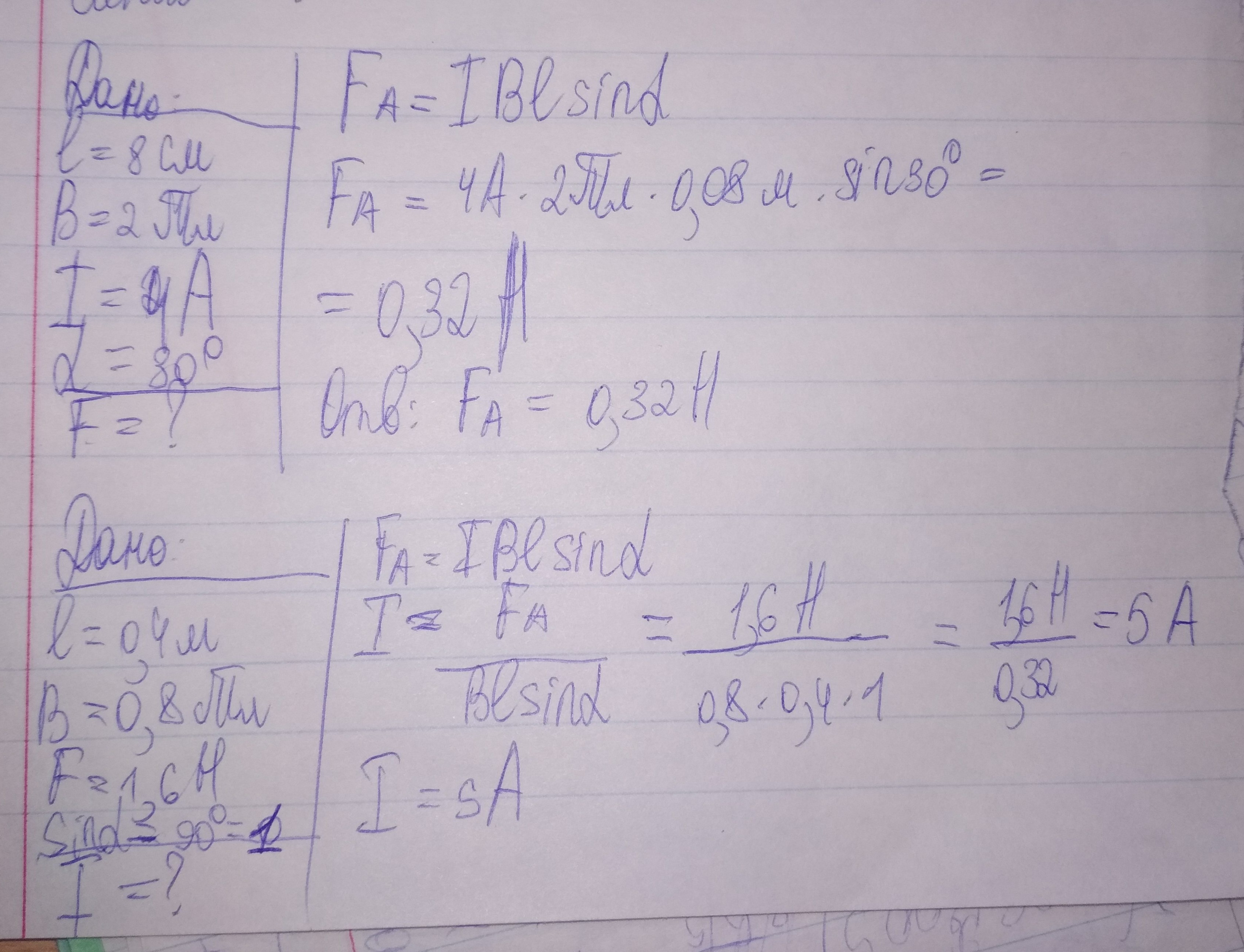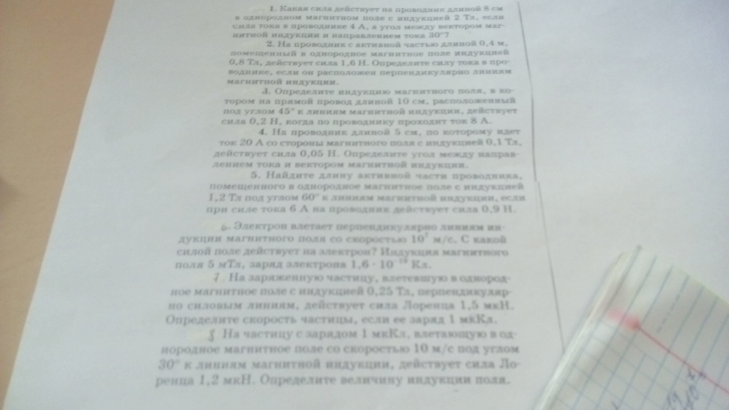 Это 1 и 2 задачи. С 1 по 5 задачу решаются по одной формуле Fампера=IBlsind, а задачи с 6 по 8 решаются по формуле силы Лоренца Fлоренца=qvBsind (q-заряд, v-скорость, B-магнитная индукция)