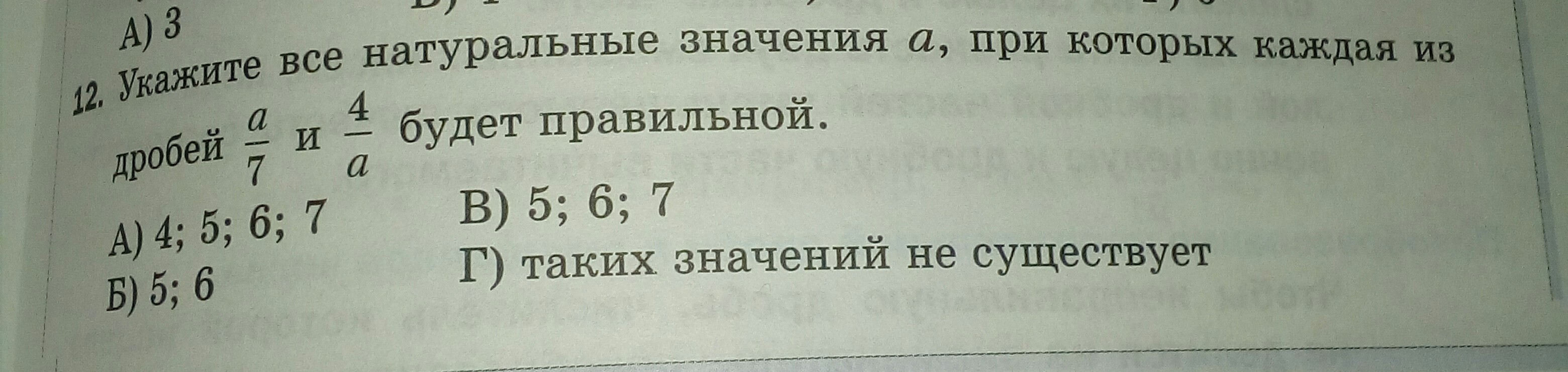Укажите все натуральные значения А при которых каждая из дробей а /7 и 4 /а будет правильной
