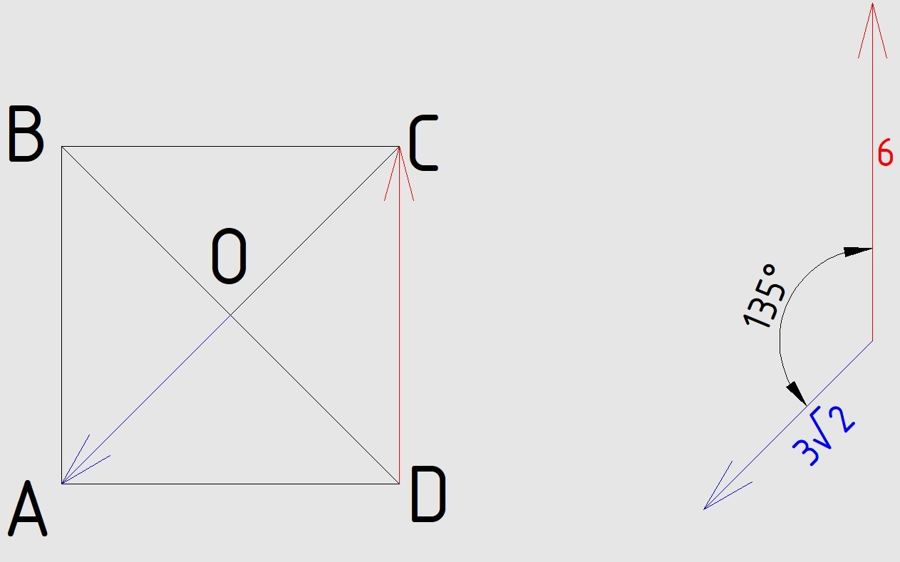 ДС·ОА = |ДС|*|ОА|*cos(β) = 6*3√2*cos(135°) = 18√2*(-1/√2) = -18