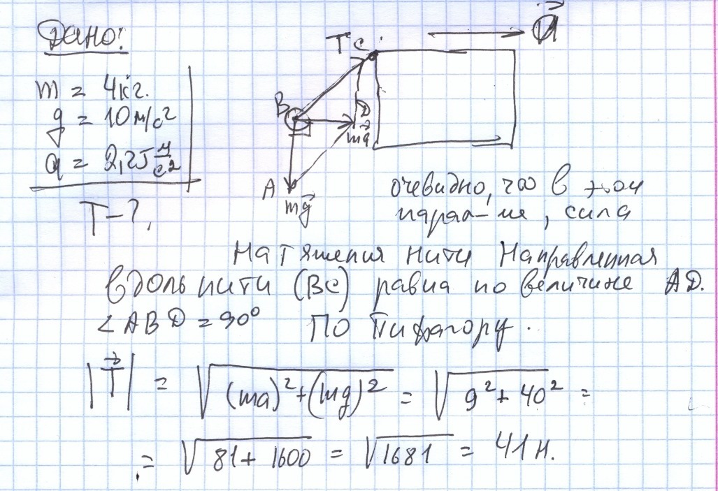 Срочно!!!!! Нить с грузом подвешена на тележке, которая движется с ускорением 2,25. Найдите силу натяжение нити после того как как она займет устойчивое наклонное положение . Масса груза 4 кг. g =10 м/с^2