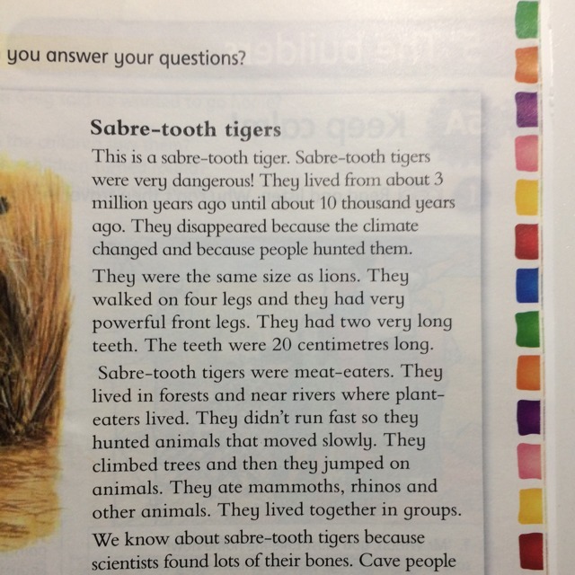 Мы знаем о саблезубых тиграх потому что ученые нашли много их костей. Пещерные люди.....