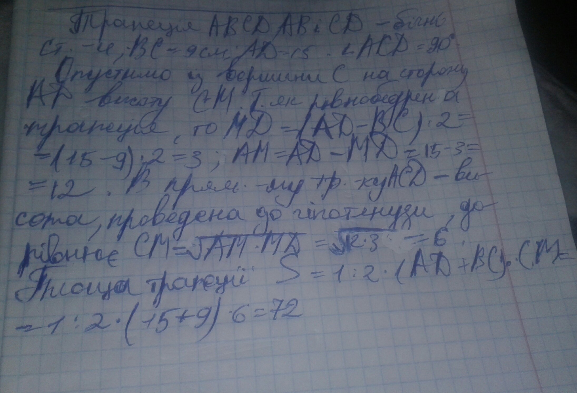 знайдіть висоту рівнобічної трапеції, основи якої дорівнюють 9 і 15 см, а діагональ перпендикулярна до бічної сторони