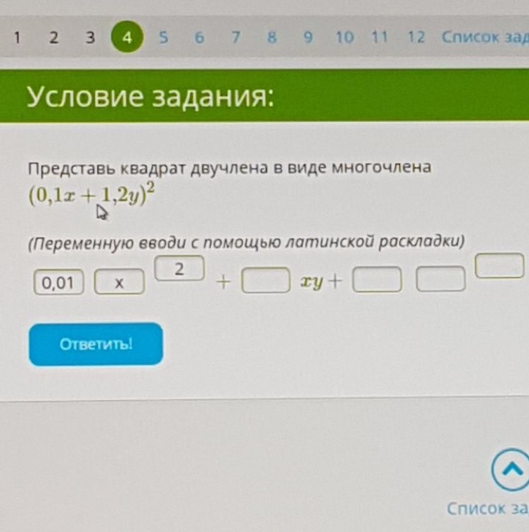 Представь квадрат двучлена в виде многочлена (0,1x+1,2y)во второй степени (переменную вводи с помощью латинской раскладки)