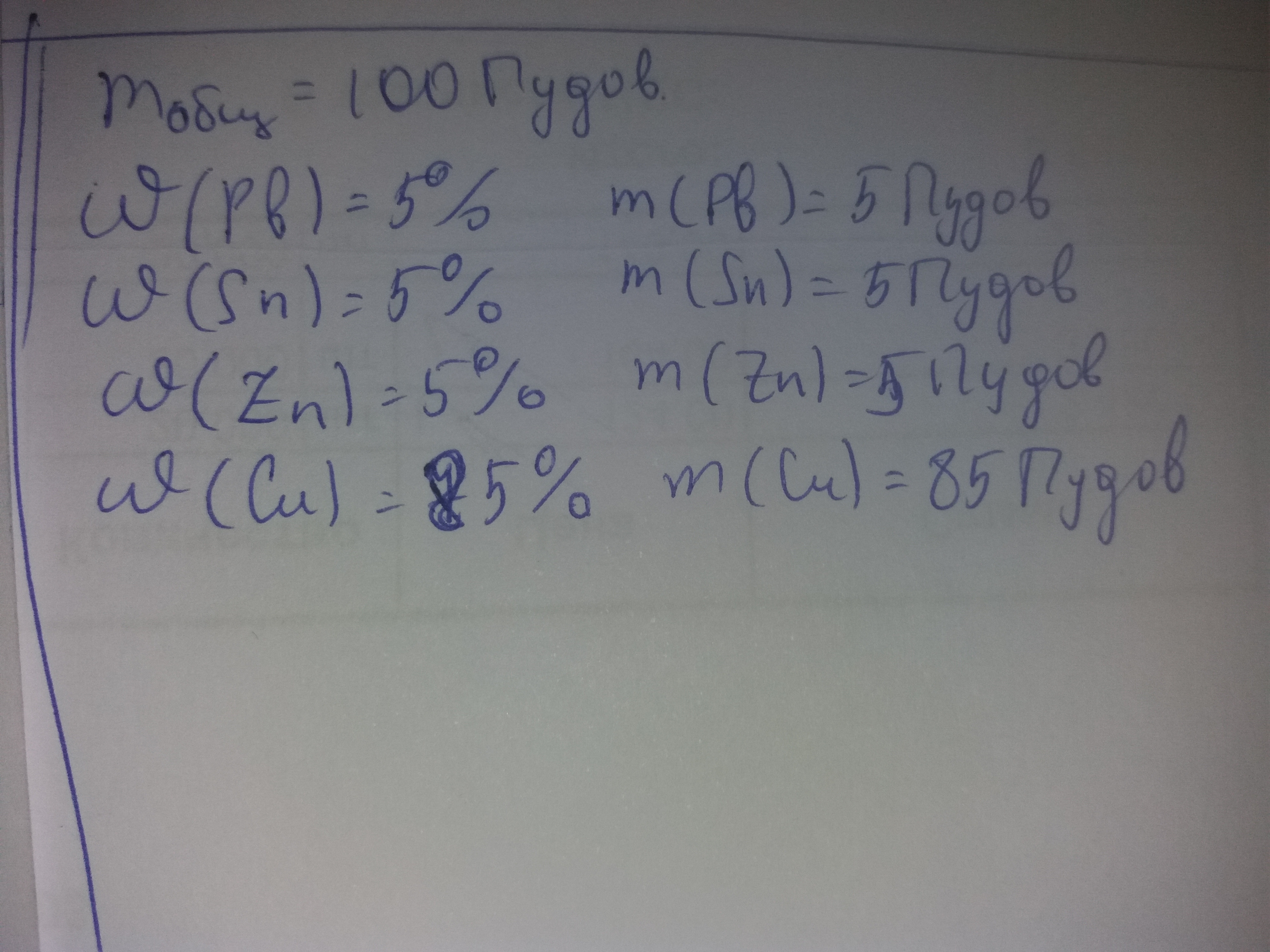 Бронза сплав меди, олова, свинца и цинка. Вычислите массы металлов в бронзовом орле массой 100 пудов, ели известно, что массовые доли олова, свинца, цинка составляют по 5%, а остальное медь.