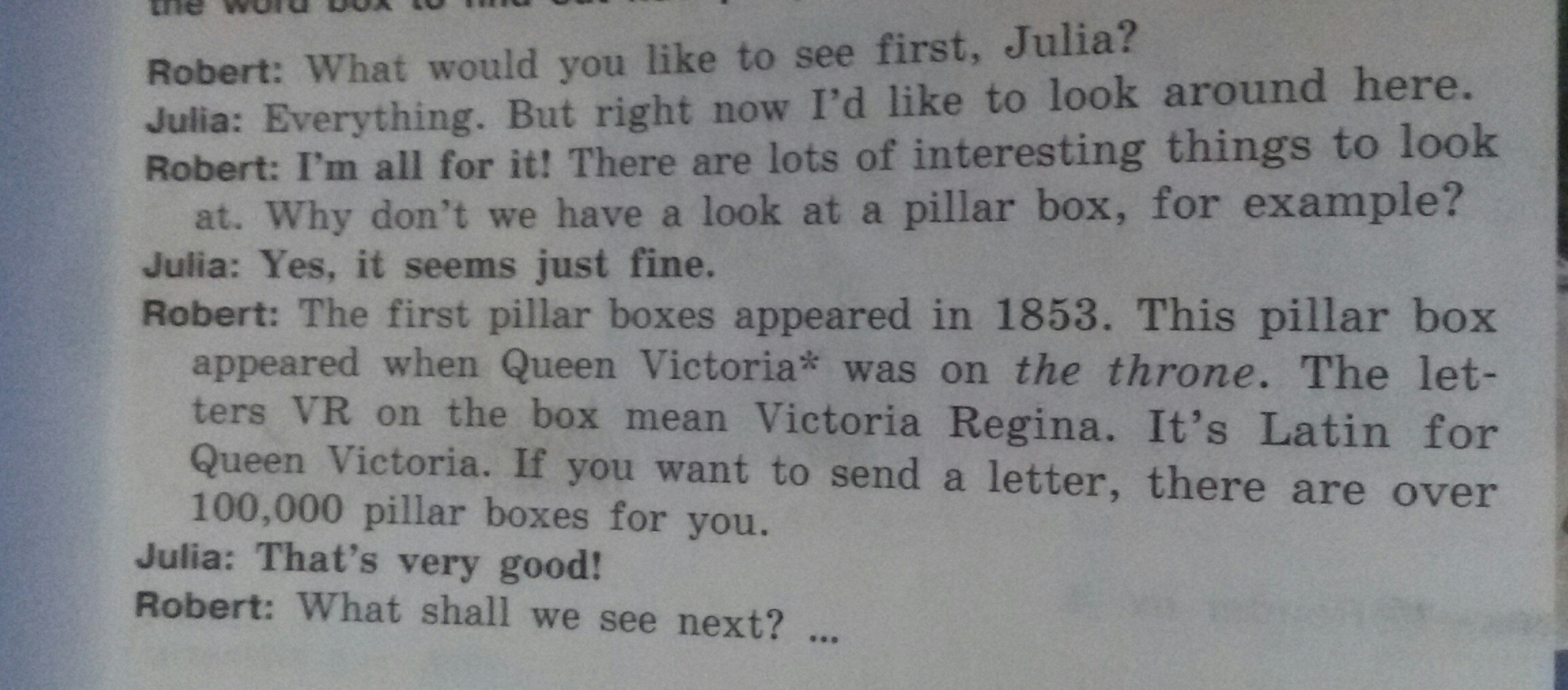 Роберт: Первые стоячий почтовый ящик появились в 1853 году. Эти почтовые ящики появились во времена когда правила Королева Виктория .Инициалы на коробке ВР означаются «Виктория Регина» . Это по латински Королева Виктория . Если ты хочешь отправить письмо, здесь более 100,000 стоячих почтовый ящиков для тебя