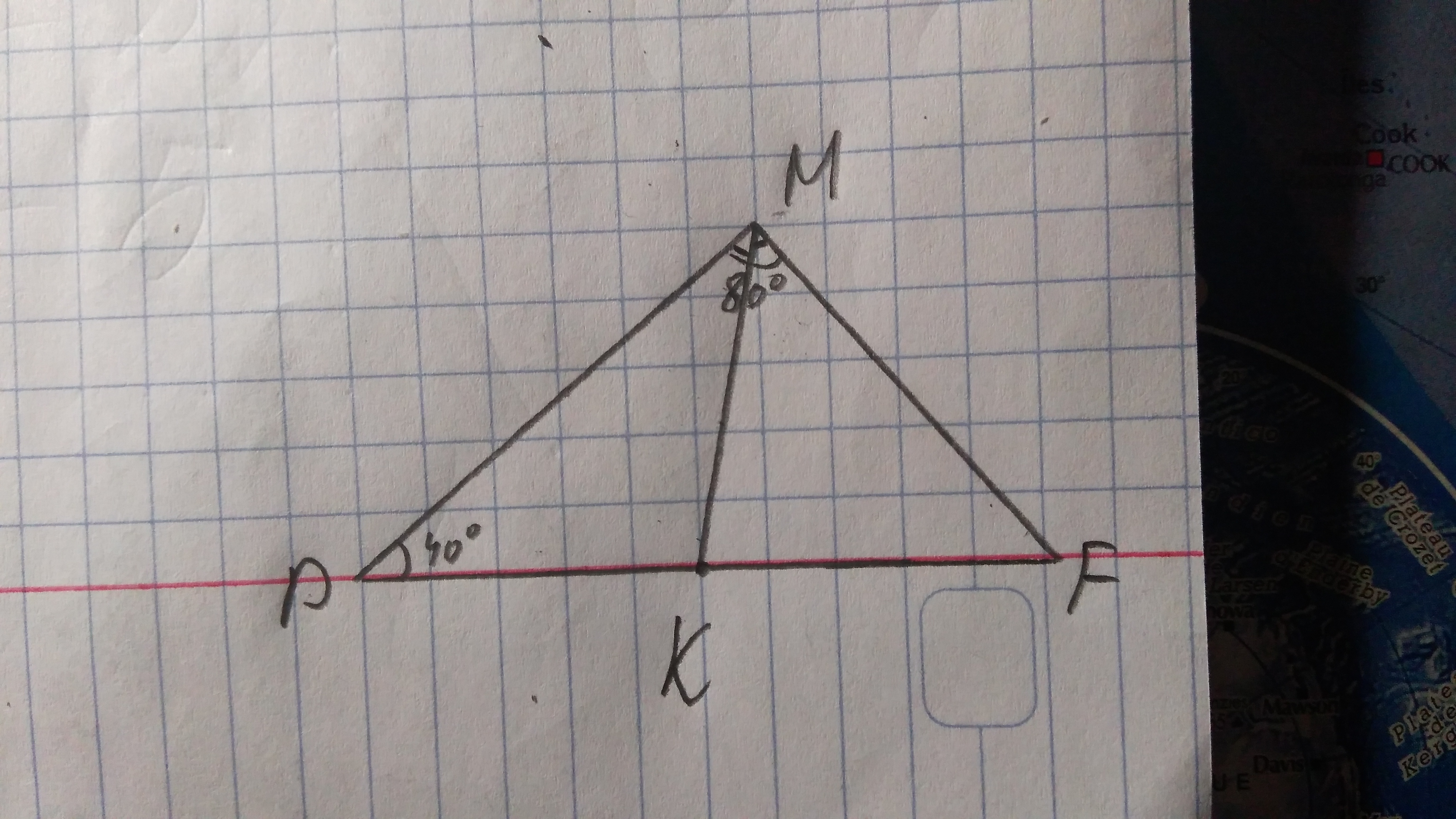 Второй способ. В треугольнике MPF: угол F=60°, т.к. сумма всех углов треугольника равно 180°. В треугольнике FKM: угол М=40°, F=60°, К=80°.