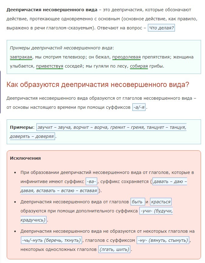Деепричастия несовершенного вида – это деепричастия, которые обозначают действие, протекающее одновременно с основным (основное действие, как правило, выражено в речи глаголом-сказуемым). Отвечают на вопрос – Что делая?