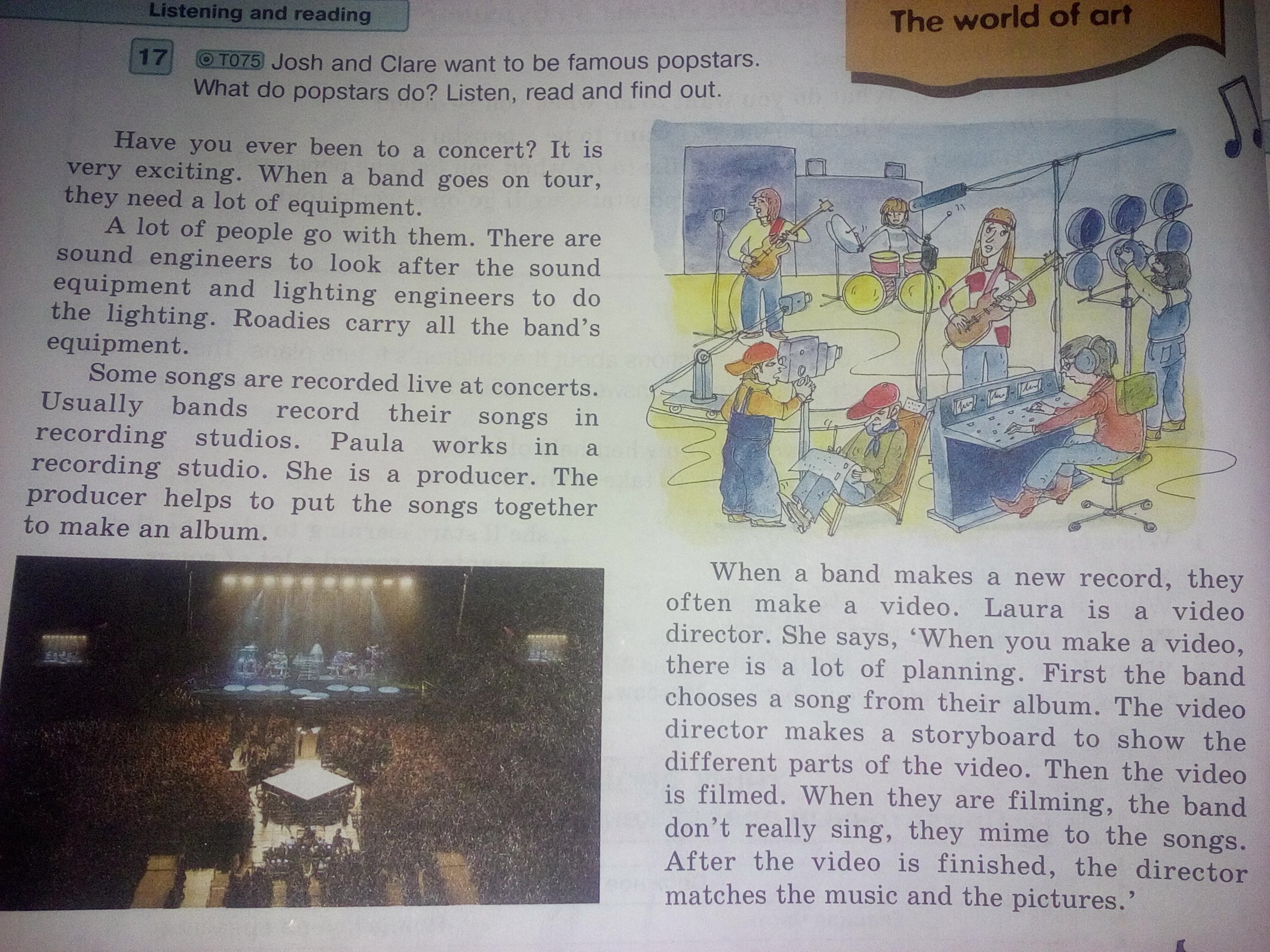 Жозе и радэн 17 Джош и моллюск хотят быть знаменитыми поп-звездами. Что делают поп-звезды? Слушайте, читайте и узнавайте. Вы когда-нибудь были на концерте? ИЛ очень интересен. Когда группа идет дальше, они нанимают много оборудования. С ними идут многие люди. Есть звуковые инженеры, которые следят за звуковым оборудованием и инженерами по освещению, чтобы сделать освещение, Дороги несут все оборудование группы. Некоторые песни записываются в прямом эфире на концертах. Обычно группы записывают свои песни в студиях звукозаписи. Паула работает в студии звукозаписи. Она продюсер, продюсер помогает собрать песни вместе. Когда группа делает новую запись, они часто делают n видео, Лаура - видеорежиссер. Она говорит: «Когда вы делаете видео, есть много планов: сначала группа выбирает песню из своего альбома. Видеорежиссер делает раскадровку, чтобы показать разные части видео. Затем видео снимается. снимаются, группа на самом деле не поет, они мимируют с песнями. После того, как видео закончено, режиссер соответствует музыке и фотографиям ».